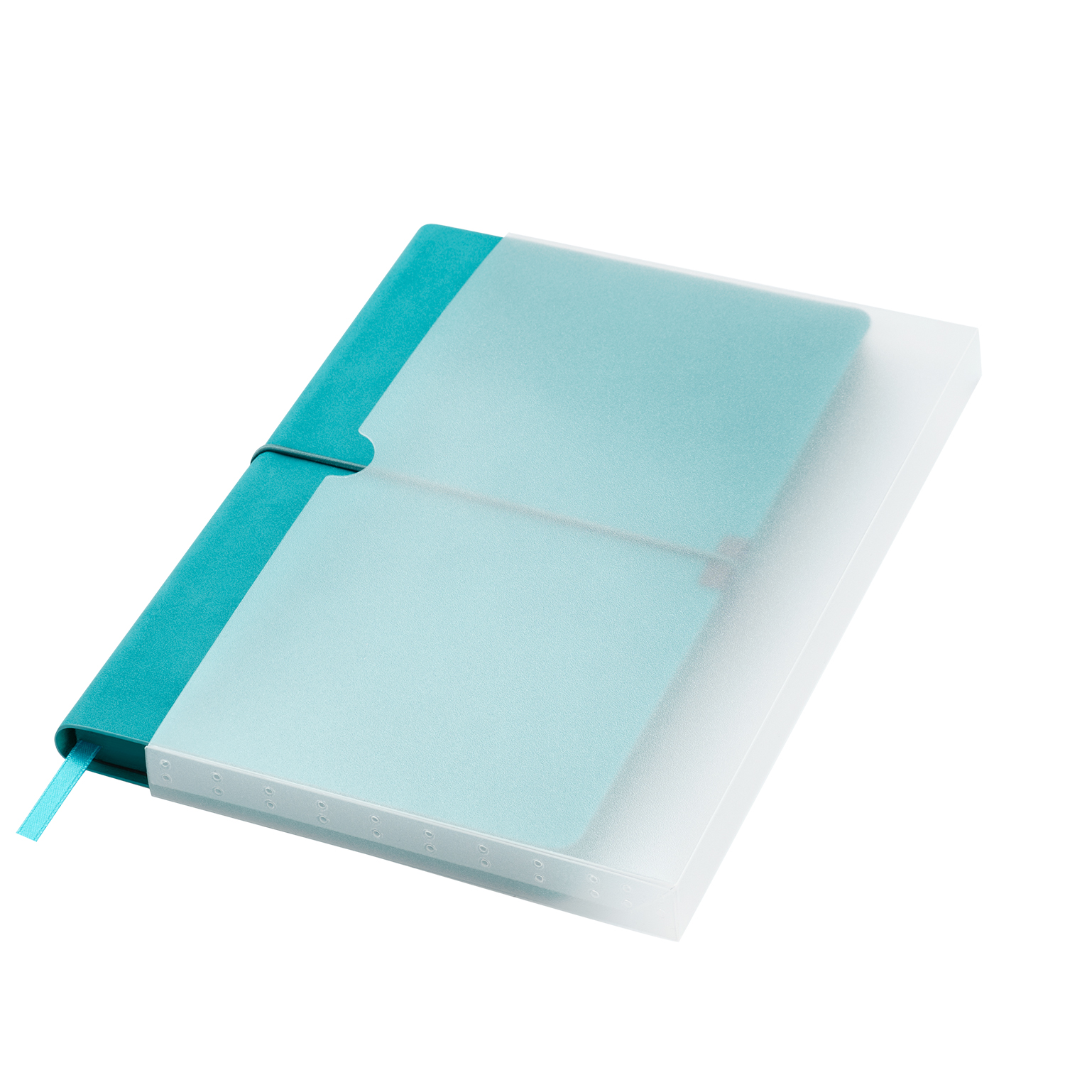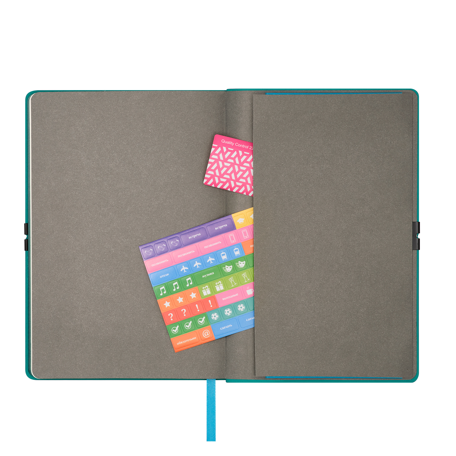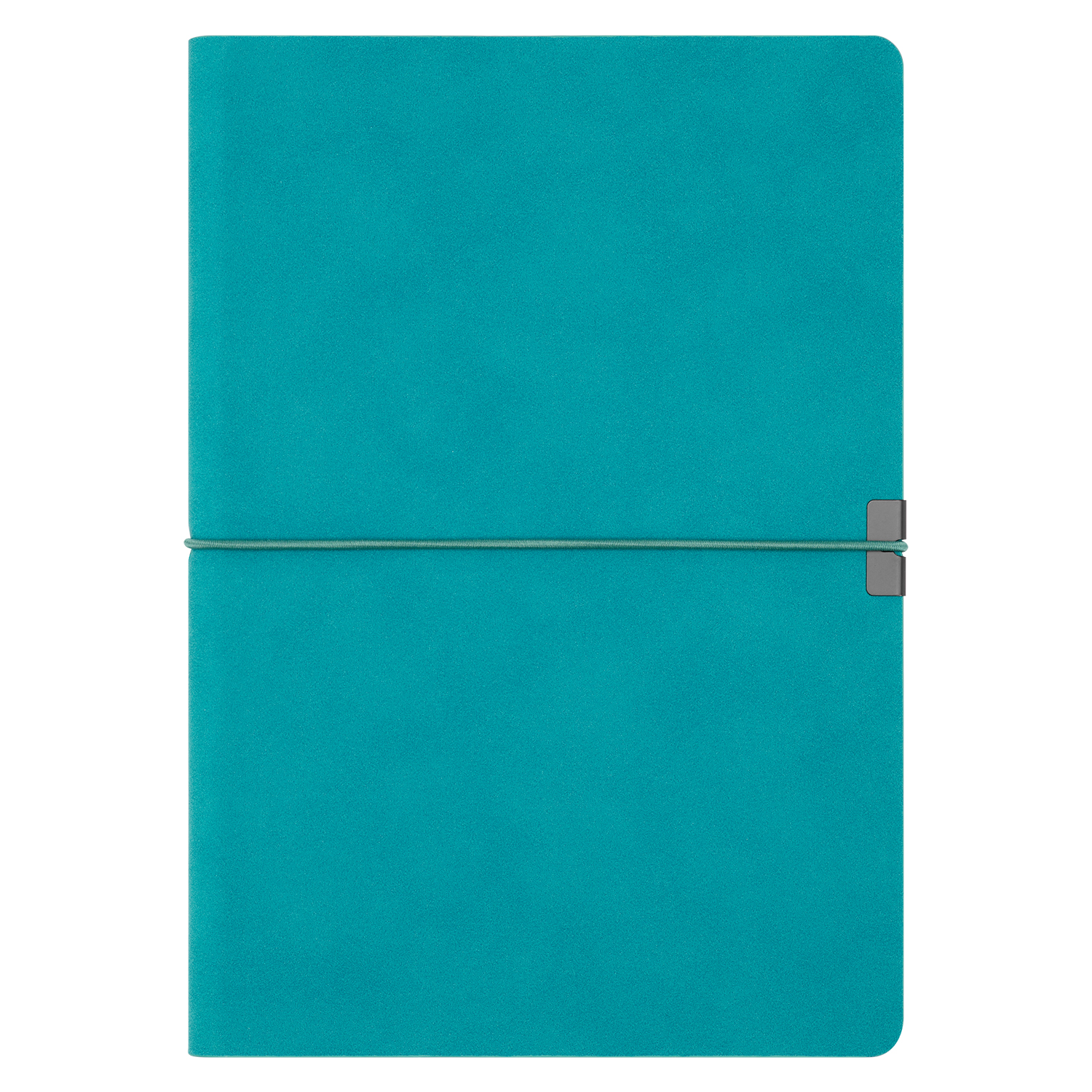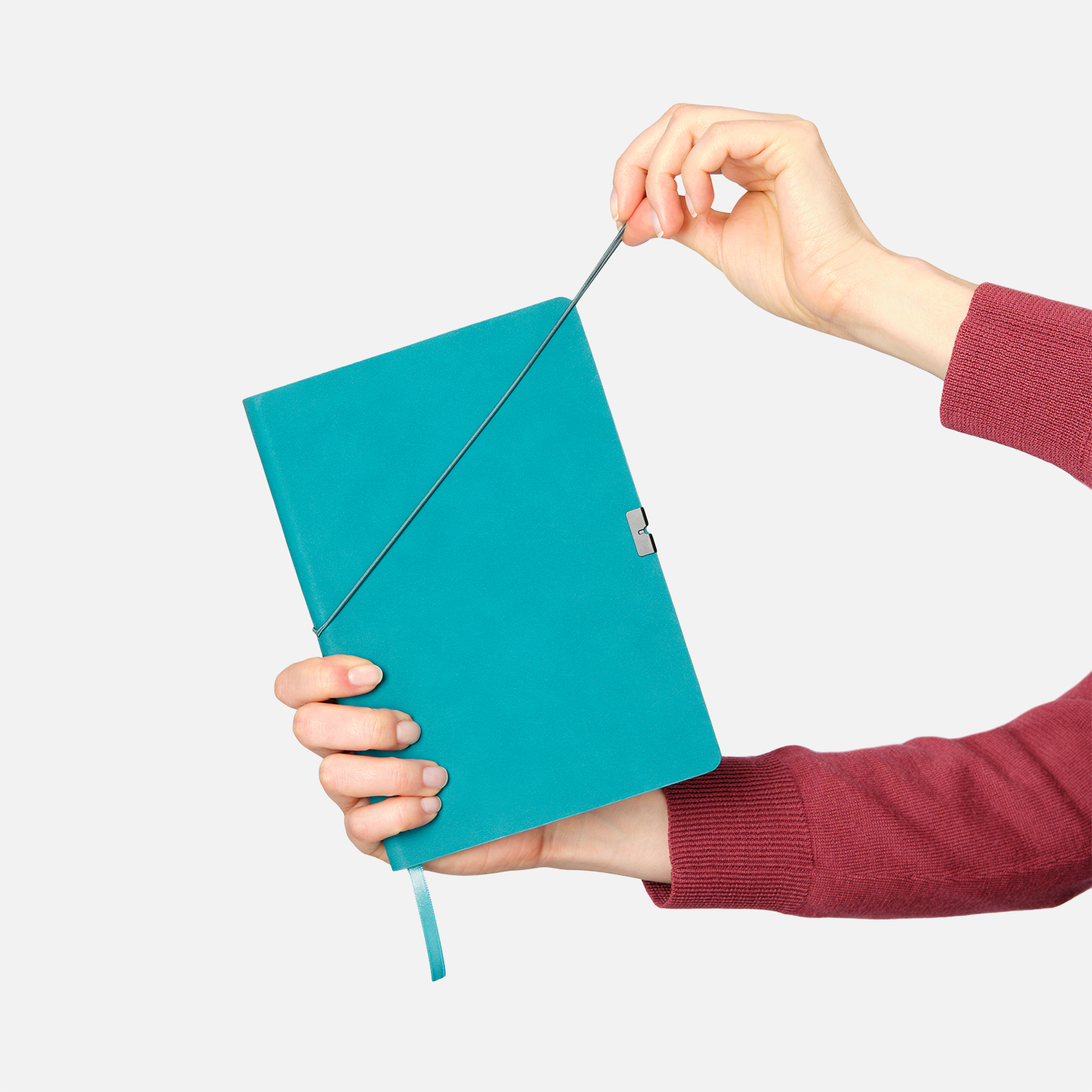 Коллекция In Velour - образец удачного сочетания минимализма со стильными элементами дизайна. Глубокий и изысканный бирюзовый цвет мягкой обложки обыгрывается горизонтальной фиксирующей резинкой. Чтобы избежать повреждений обложки, на обеих ее сторонах под резинку установлен металлический фиксатор цвета черный никель - он не только улучшает внешний вид аксессуара, но и функционально полезен. Цветовой ансамбль дополняется и матовым цветным срезом, выполненным в тон обложке. Поверхность ежедневника приятна на ощупь: материал напоминает нубук и имеет бархатистую поверхность. Также эффектность аксессуара поддерживается контрастными форзацем и нахзацем серого цвета и светло-кремовыми страницами из гладкого, слегка шелковистого офсета. Бирюзовое атласное ляссе органично завершает внешний вид ежедневника.