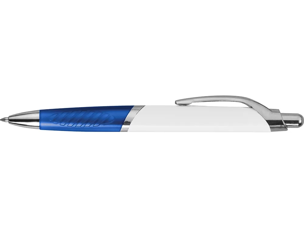 Надежная шариковая ручка с белым корпусом и цветной вставкой. Нажимной механизм, оригинальная форма клипа. Будет хорошим промосувениром для вашей компании. На пластиковый корпус возможно нанесение методом тампопечати.