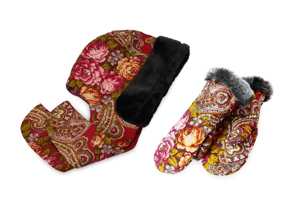 Подарочный набор: Павлопосадский капор, варежки, красный/разноцветный