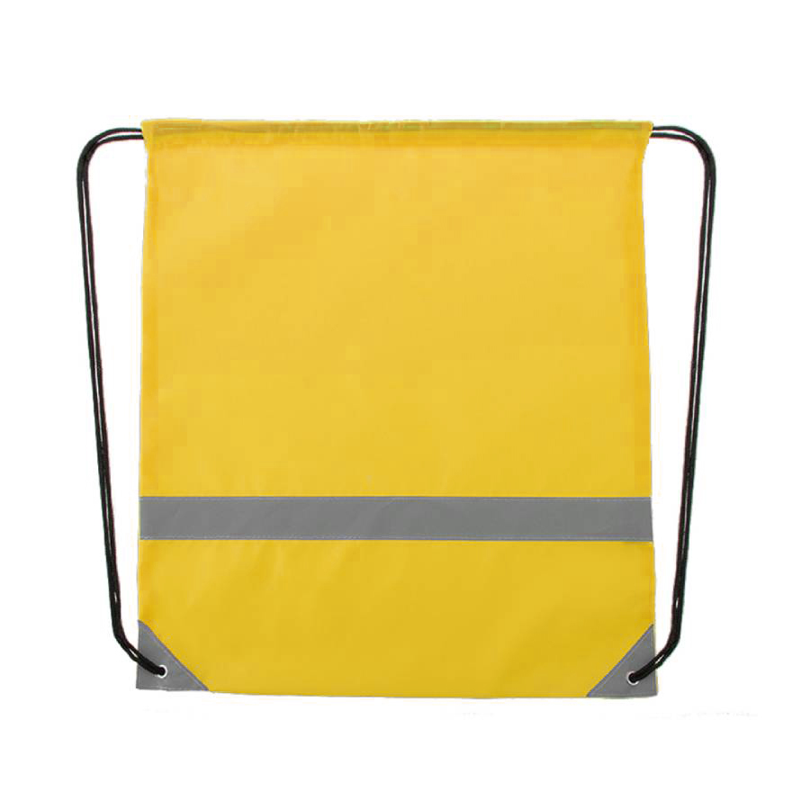 Рюкзак из мягкого полиэстера 190T со светоотражающей полосой спереди. Самозакрывающиеся черные завязки и светоотражающие уголки, усиленные металлическими кольцами.
