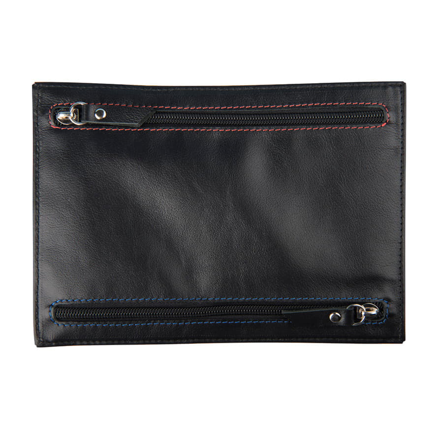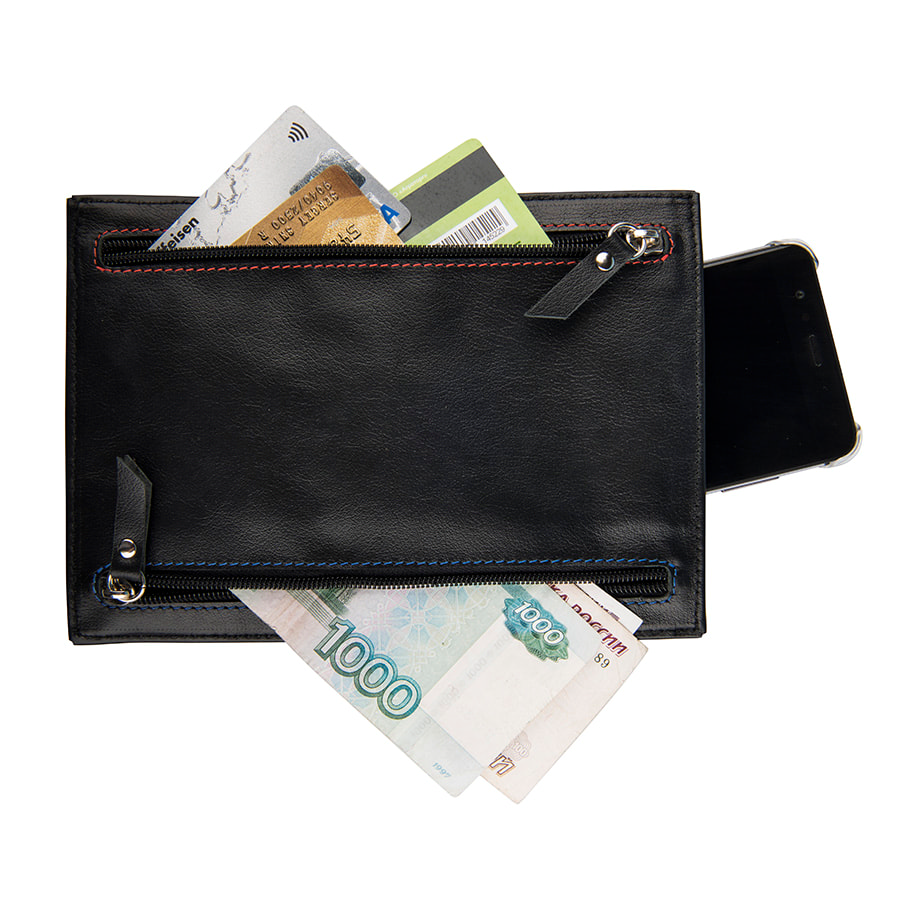 4 кармана на фронтальной поверхности, каждый выделен цветом, чтобы было удобнее запомнить расположение документов/денег по цвету. В двух карманах дополнительно есть холдеры для кредитных карт/визиток.