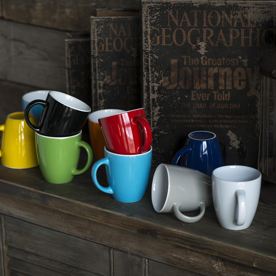 Широкая линейка цветов от строго черного и нежного белого до стильного оранжевого и глубокого красного, цветное глянцевое покрытие снаружи и белый цвет внутри, небольшая емкость (310 мл) делают ее идеальным решением любой маркетинговой задачи.