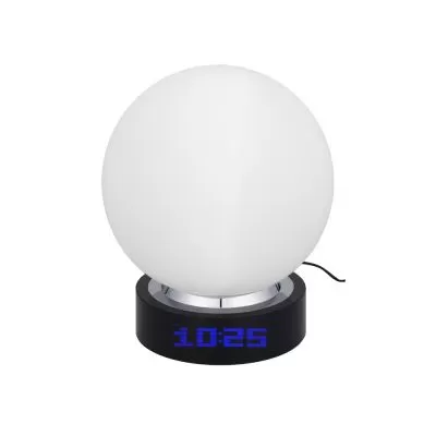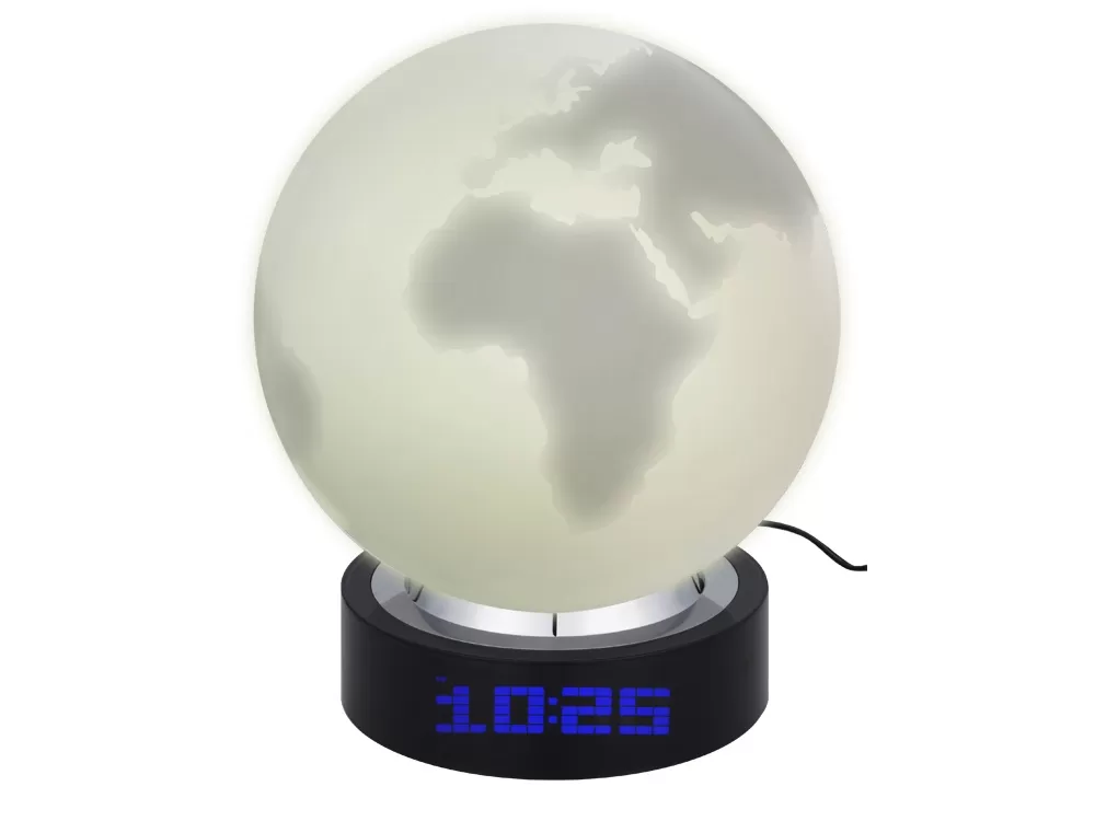 Лампа настольная с часами, датой и термометром. При включении на поверхности лампы появляется стилизованное изображение земного шара