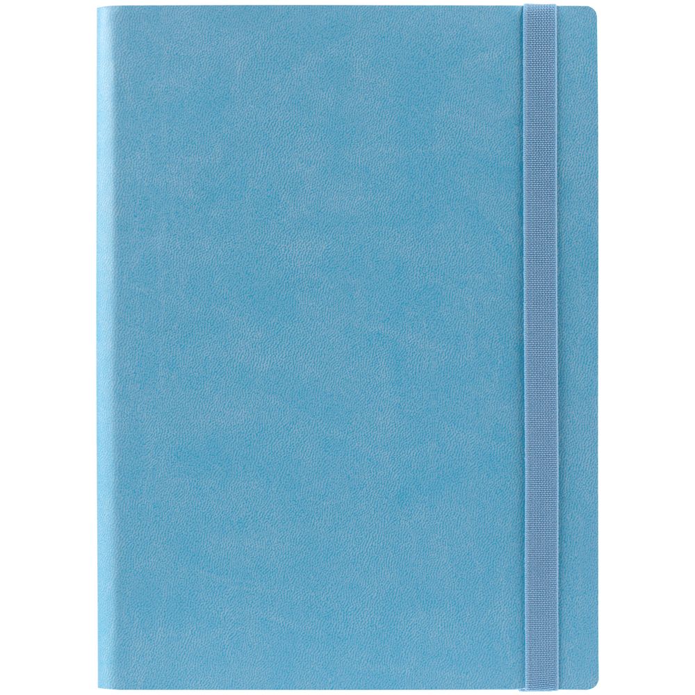 Ежедневник с гибкой обложкой выполнен из материала Latte, голубой JJ, и дополнен резинкой шириной 1 см, капталом и ляссе голубого цвета.