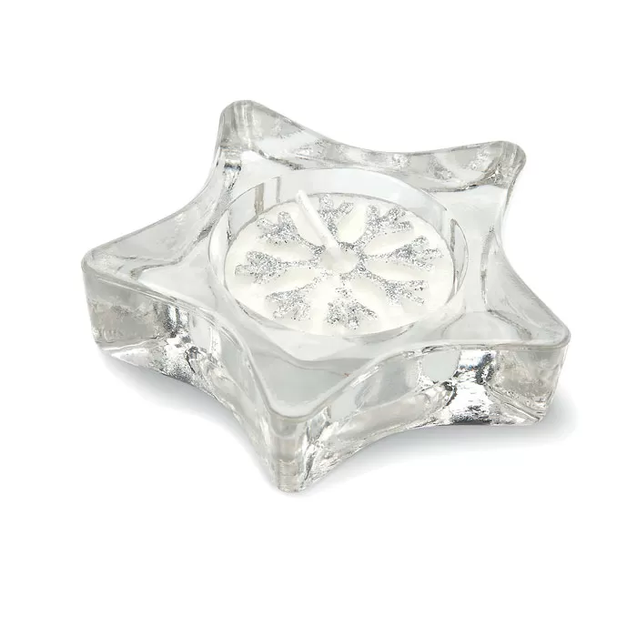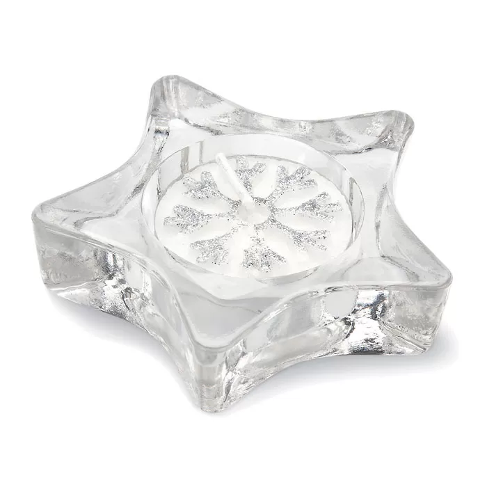 Стеклянный подсвечник со свечой в форме звезды в подарочной серебряной коробочке с прозрачной крышкой и декоративной ленточкой.