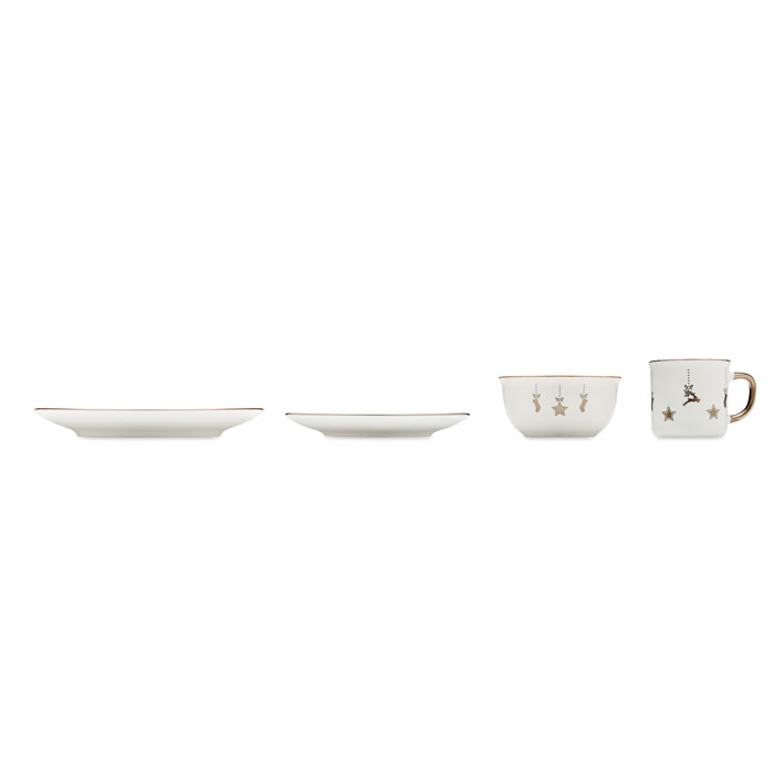 Рождественский керамический сервиз из 4 предметов. Включает: обеденную тарелку, тарелку для завтрака, миску для хлопьев/салата (500 мл) и кружку (300 мл). Поставляется в подарочной коробке.