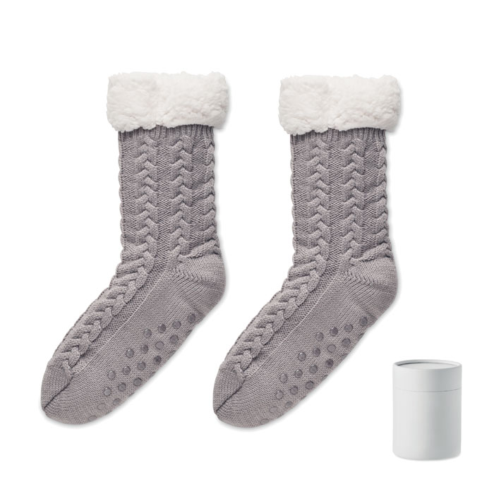 Вязаные носки с нескользящей подошвой из акрила и подкладкой из искусственной шерпы плотностью 240 гр/м². Поставляются в подарочной упаковке. Размер L= 40-43.
