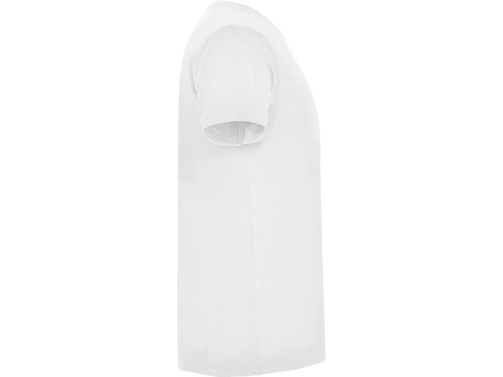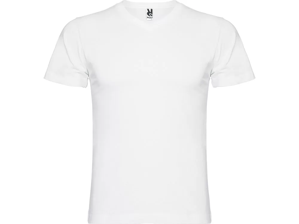 Мужская футболка без боковых швов с коротким рукавом и V-образным вырезом горловины, отделанном рибом 1х1. Горловина и плечевые швы дополнительно укреплены тесьмой.