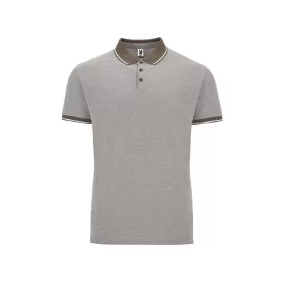 Рубашка поло с коротким рукавом. Манжеты и воротник из однотонного риба 1х1 с контрастными полосками. Планка на 3 пуговицы. Низ с боковыми разрезами, отделанными тесьмой. Спинка немного длиннее полочки. Полотно с меланжевым эффектом.