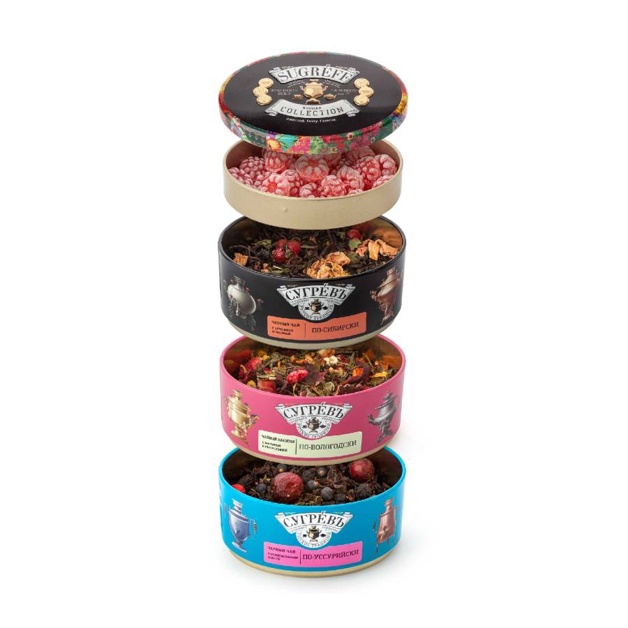 Подарочный набор из 3 эксклюзивных купажей листового чая, трав и ягод, характерных для разных регионов России, в жестяной банке. В крышке верхней баночки находятся вкусные и эффектные леденцы в форме малинки. Все купажи 100 % натуральные.