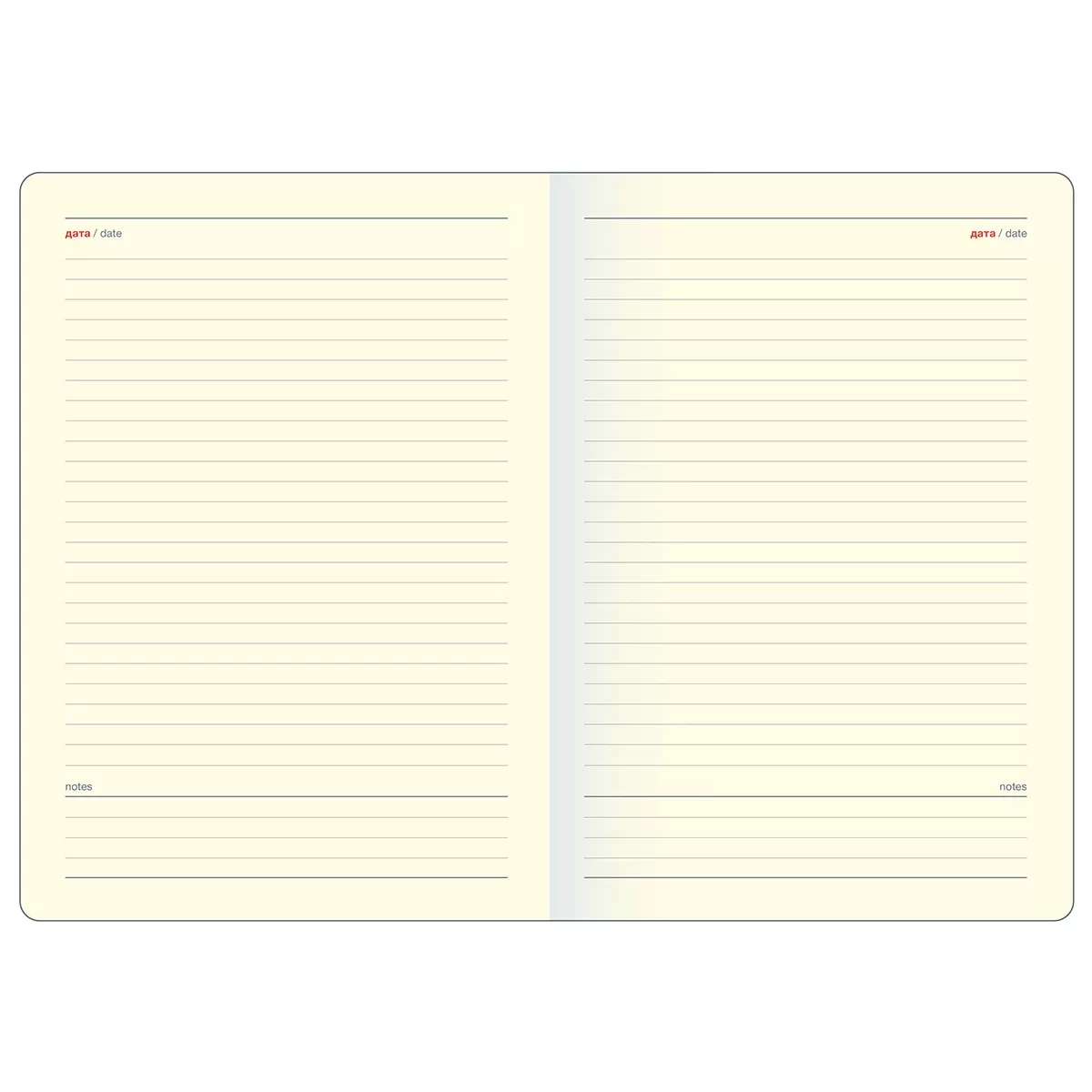 Недатированный внутренний блок в линейку на 160 листов (320 страниц) - из высококачественной бумаги цвета слоновой кости плотностью 70 г/м2 с прямыми уголками. Информационный блок ежедневника включает в себя: титульный лист, планнер на каждый месяц и развороты для заметок в начале и конце блока.