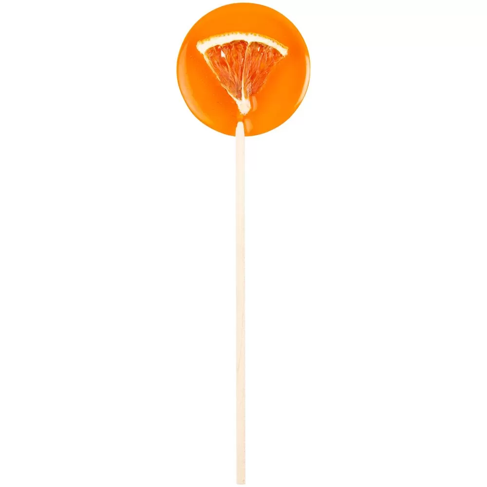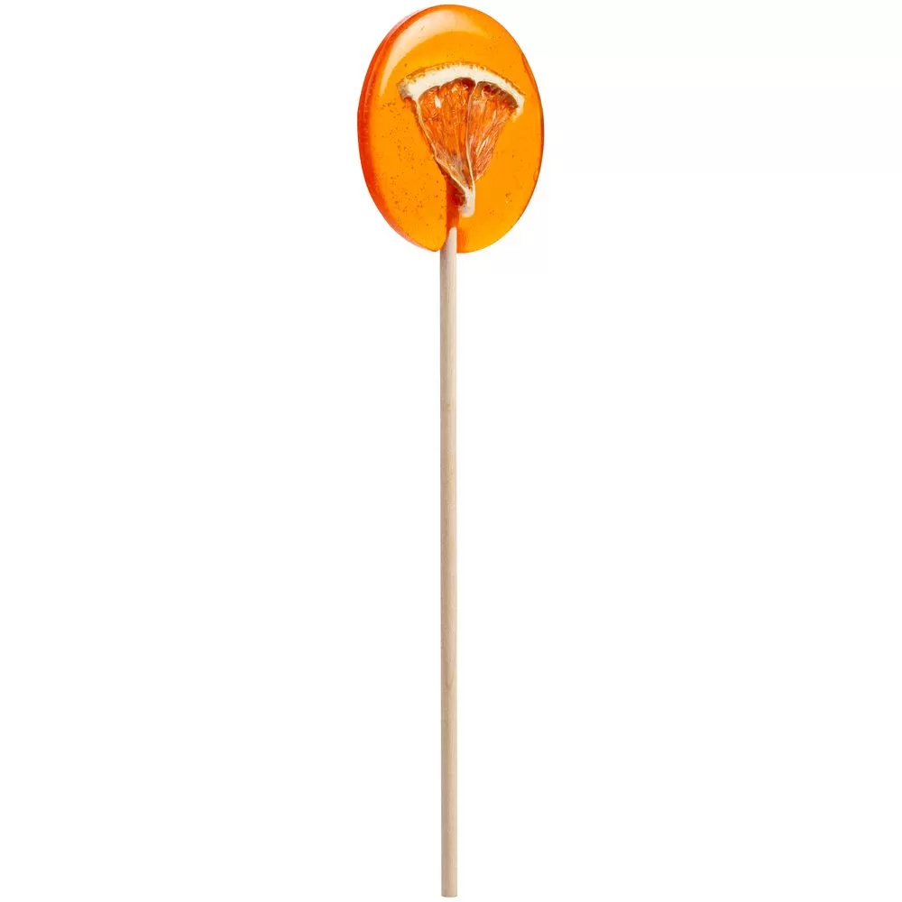 Конфета из изомальта на палочке с сушеным апельсином внутри.Состав: изомальт, сушеный апельсин, пищевой краситель.