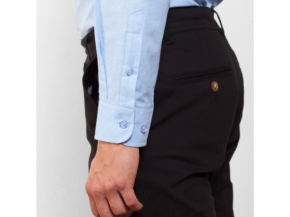 Мужская рубашка с длинным рукавом, накладной карман слева. Планка на пуговицах. Отложной воротник на стойке продублирован пуговицами. Манжета регулируется по ширине с помощью 2-х пуговиц. Кокетка на спинке.