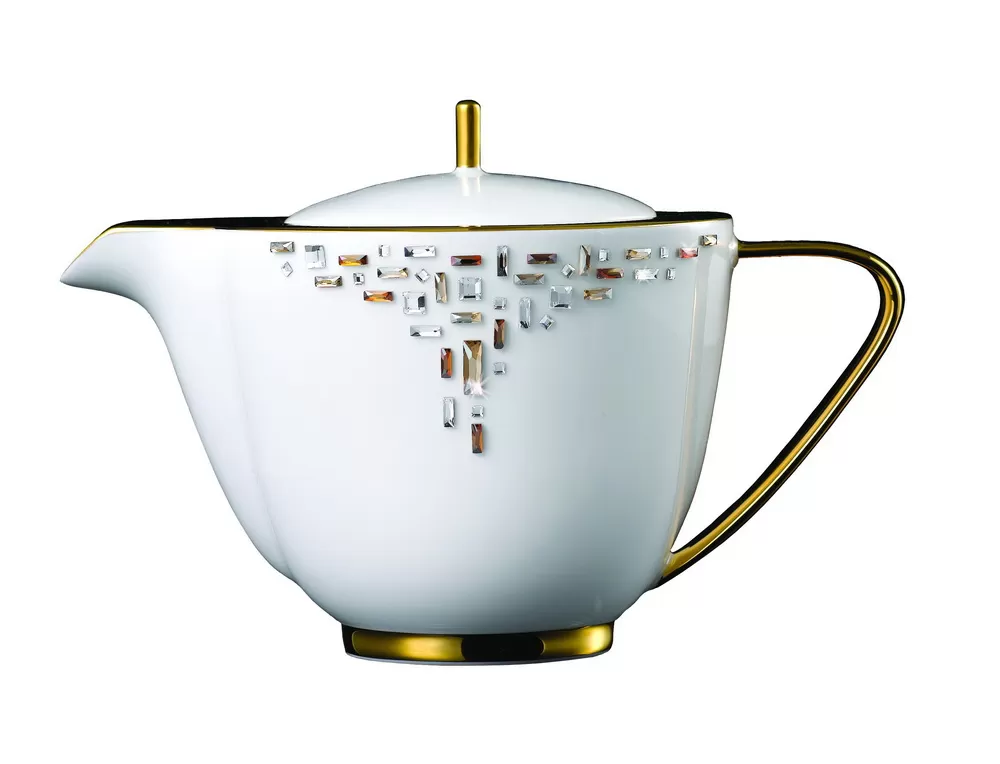 Крупные кристаллы Сваровски, тонкие золотые линии на белом фарфоре и лаконичная форма чайника делают его настоящим украшением интерьера дома, кухни или обеденного стола.