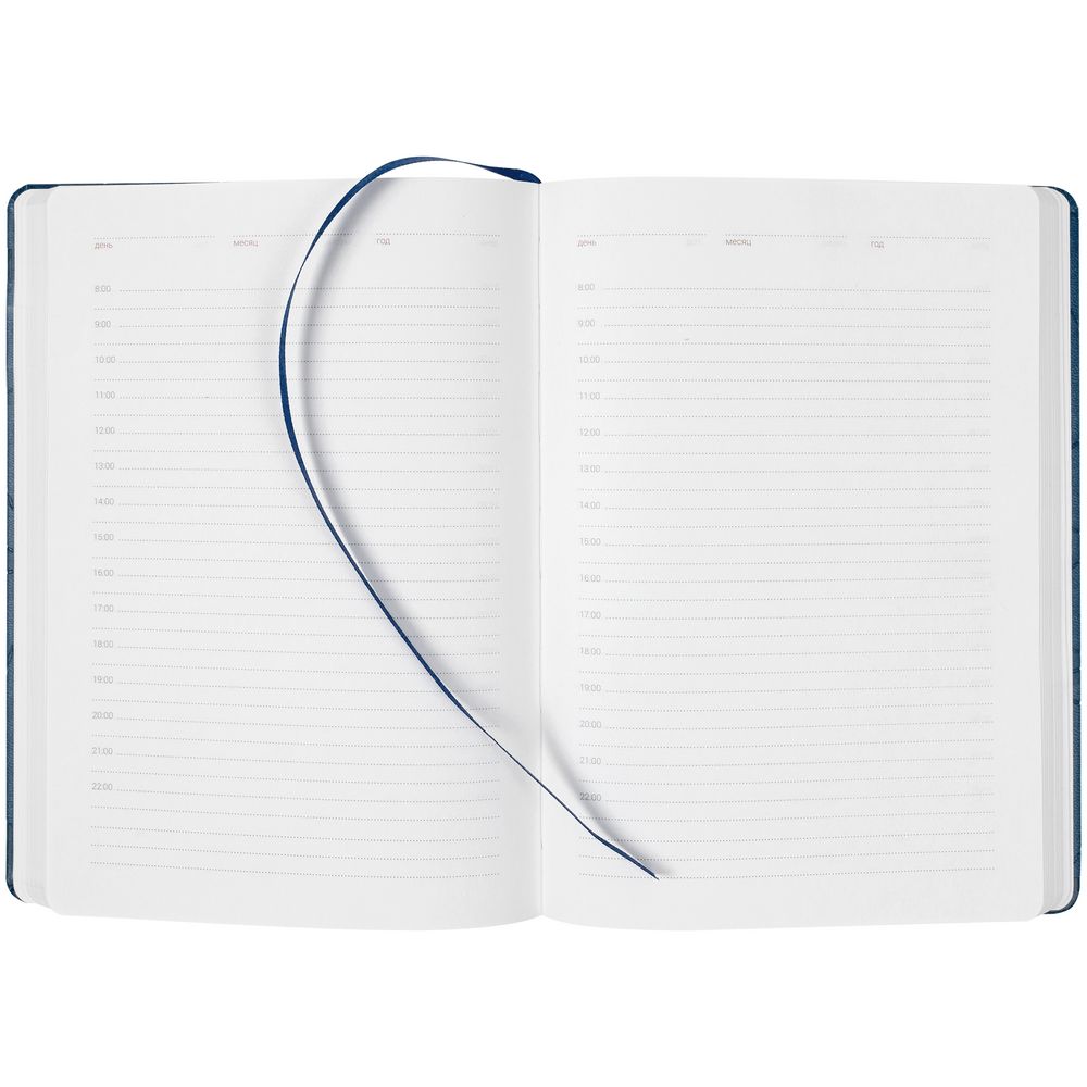 Ежедневник с твердой обложкой, выполнен из материала Brand, синий НН, с тиснением и выборочным УФ-лаком. Дополнен ляссе в цвет обложки.