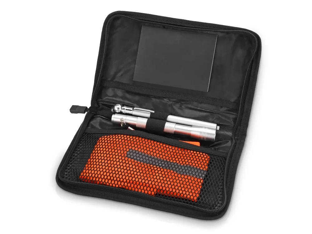 Дорожный набор Favorite пригодится в каждой машине. В автомобильный комплект входят такие полезные вещи как ручка, фонарик, прибор для измерения давления в шинах, блокнот, жилет со светоотражающими элементами.