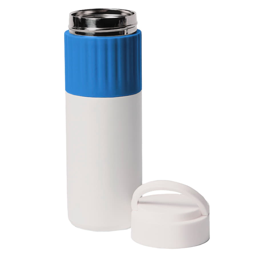 Стильный белый матовый корпус термоса с цветной силиконовой манжетой