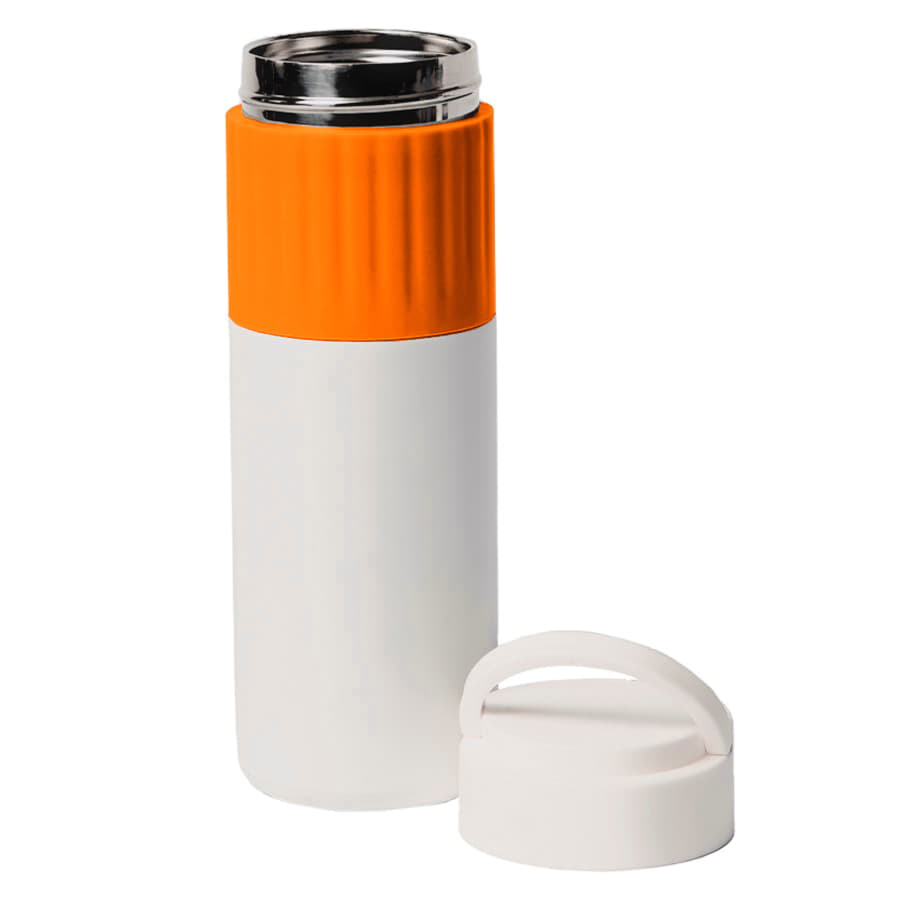 Стильный белый матовый корпус термоса с цветной силиконовой манжетой