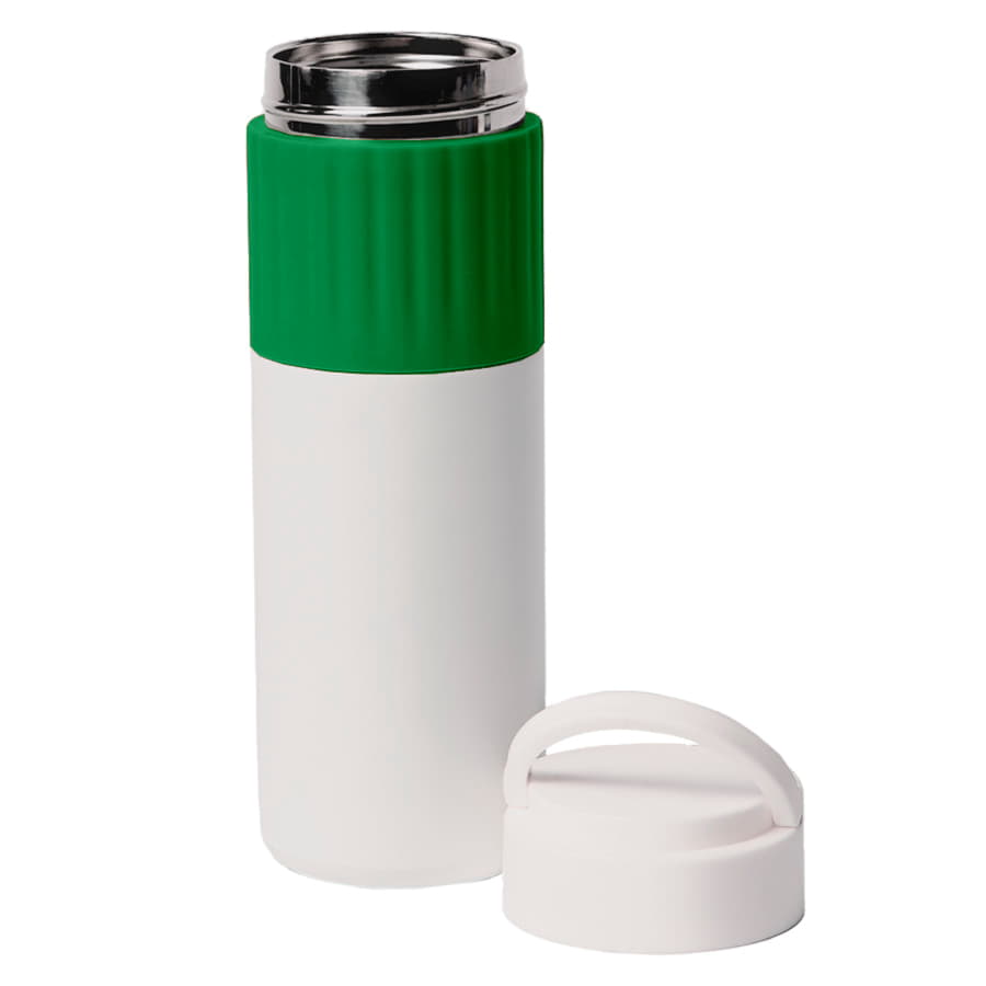 Стильный белый матовый корпус термоса с цветной силиконовой манжетой