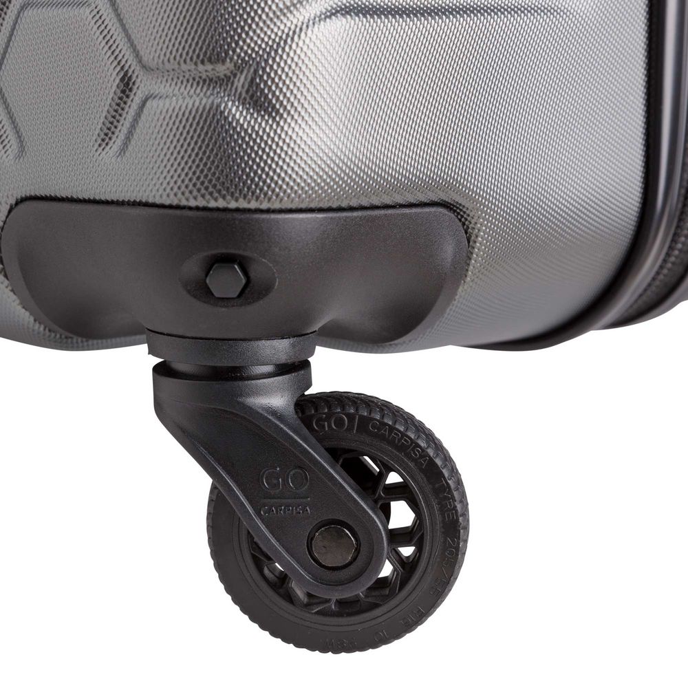 Серия чемоданов Carpisa Gotech изготовлена из сверхпрочного и устойчивого к царапинам материала, который на 70% состоит из смеси переработанного пластика и поликарбоната. Внутренняя подкладка чемодана выполнена из 100% переработанного сырья — а значит, отражает экологичный подход своего обладателя к использованию ресурсов.