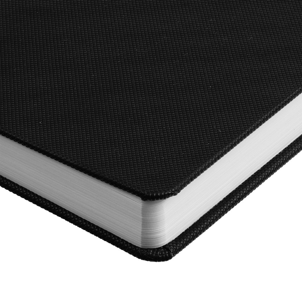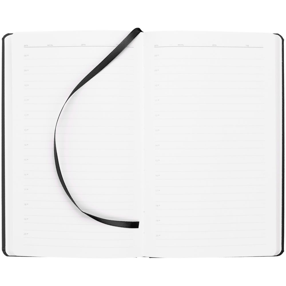 Ежедневник с твердой обложкой, выполнен из материала Canyon, черный АА, дополнен ляссе в цвет обложки.