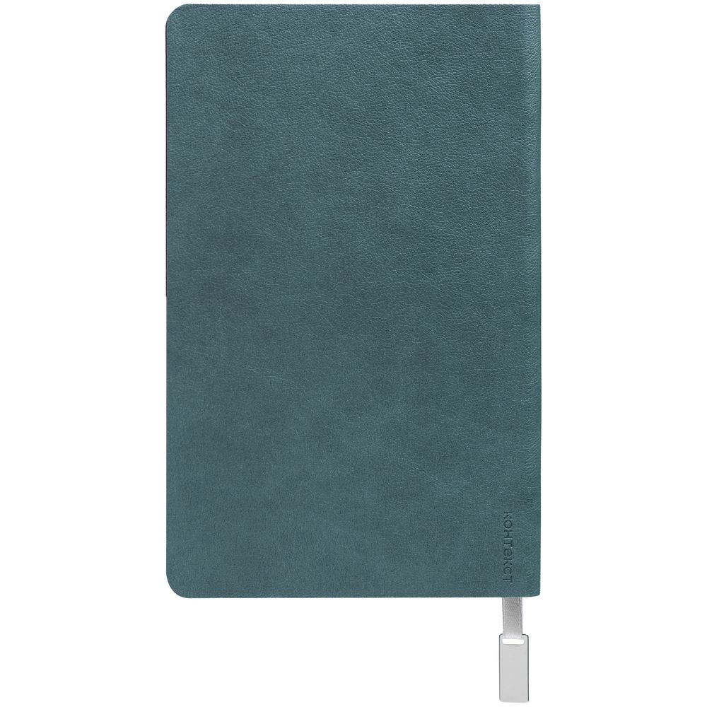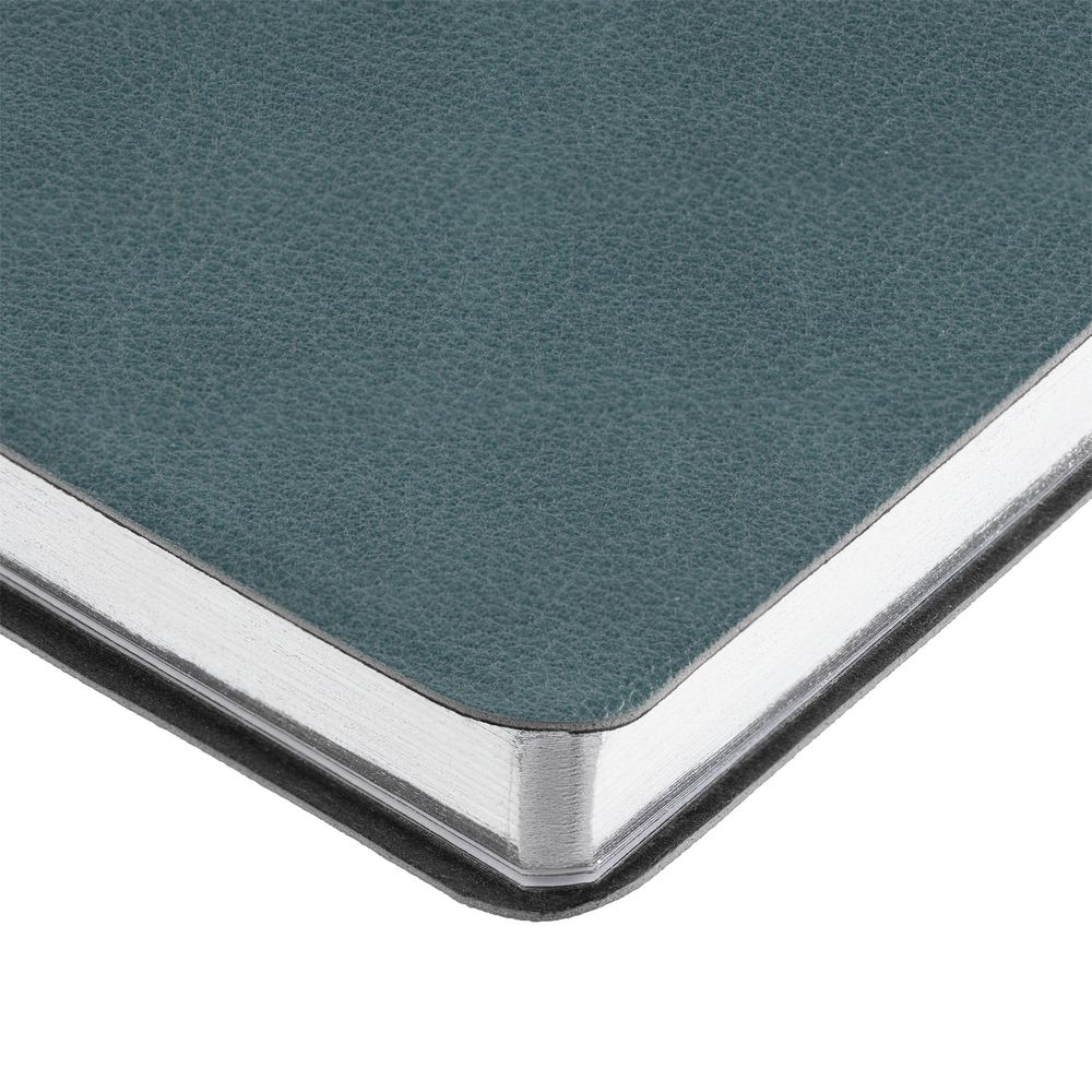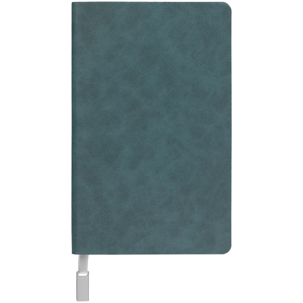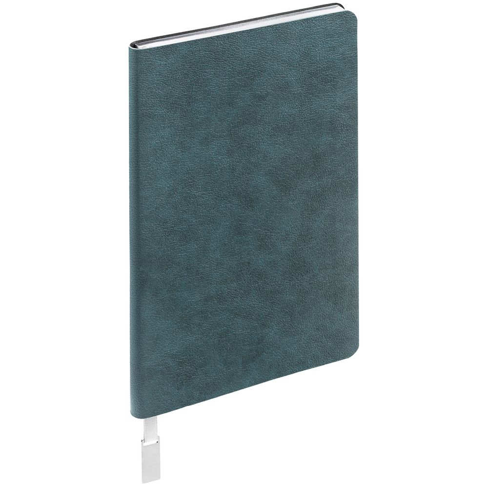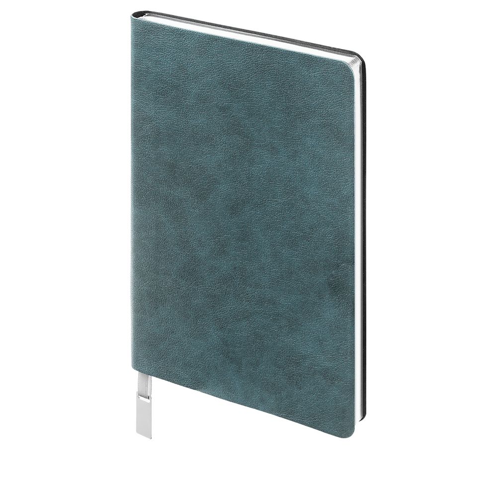 Ежедневник с гибкой обложкой, выполнен из материала Petrus, голубой JJ, дополнен серым ляссе с металлическим шильдиком.