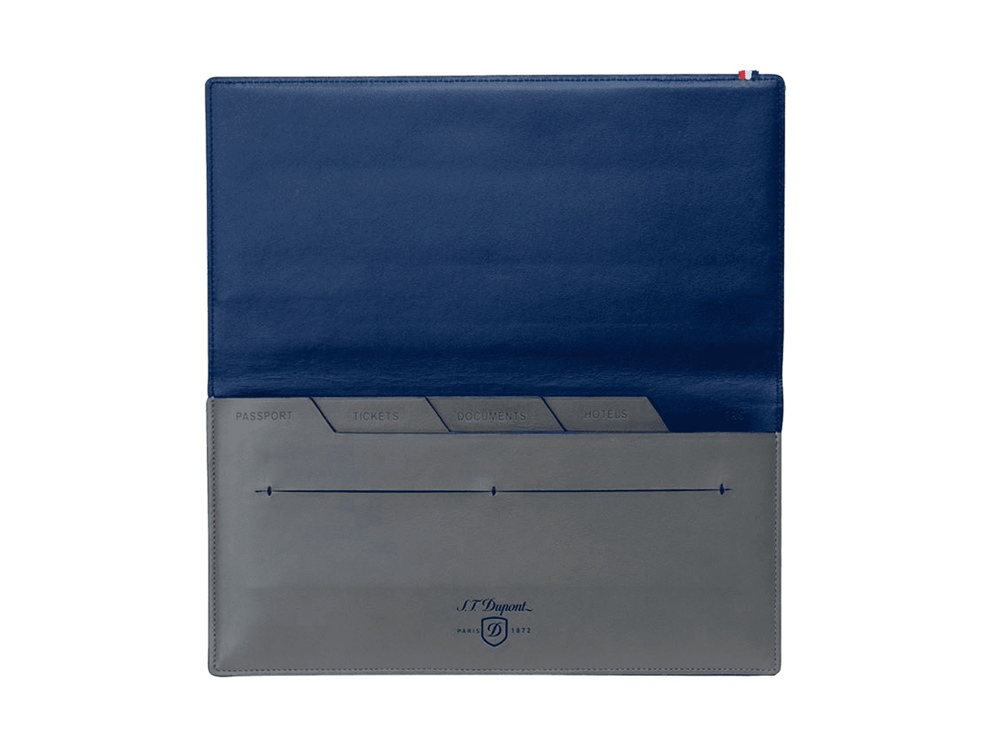 Органайзер для путешествий из телячьей кожи, серой снаружи и синей внутри, вмещает в себя все необходимые документы в поездке. Модель имеет четыре отделения внутри: для паспорта, билетов, сопутствующих документов и броней отелей, а также два прорезных кармана для кредитных карт. Снаружи дорожный ежедневник дополнен карманом и тисненым логотипом S.T. Dupont.