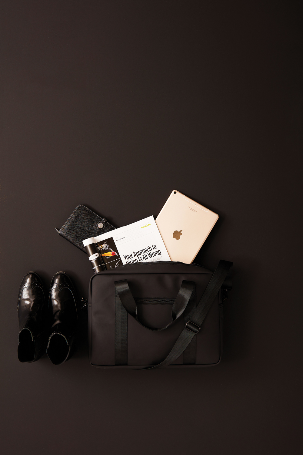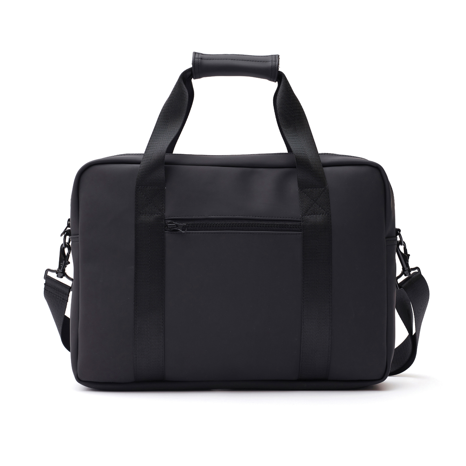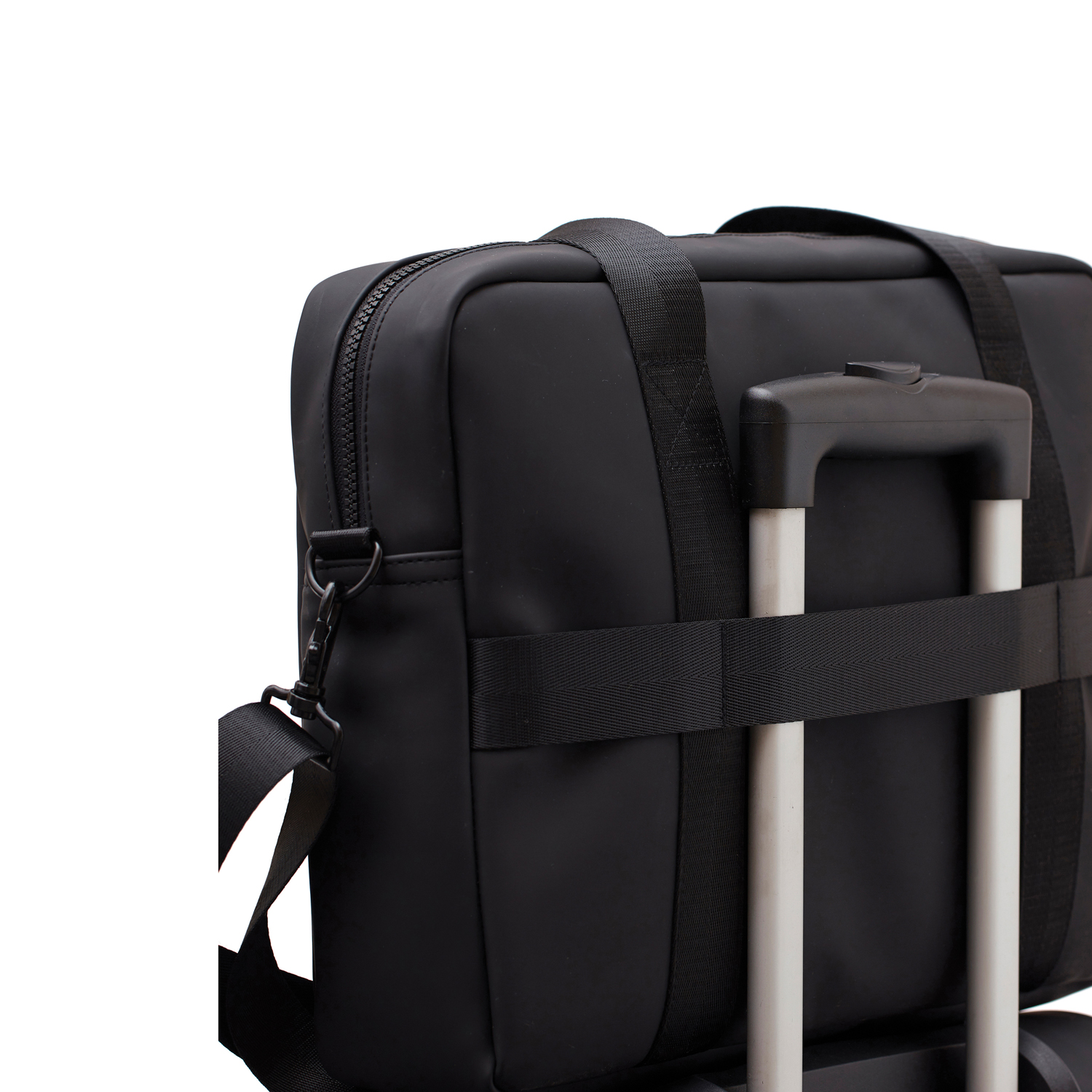 Современная сумка для ноутбука в минималистичном дизайне. Помимо основного отделения предусмотрены карманы для важных мелочей: ручек, документов, смартфона. Сумка изготовлена из водоотталкивающего материала, есть плечевой ремень и короткие ручки для переноски. С обратной стороны расположен багажный ремень, что делает изделие незаменимым в путешествиях.