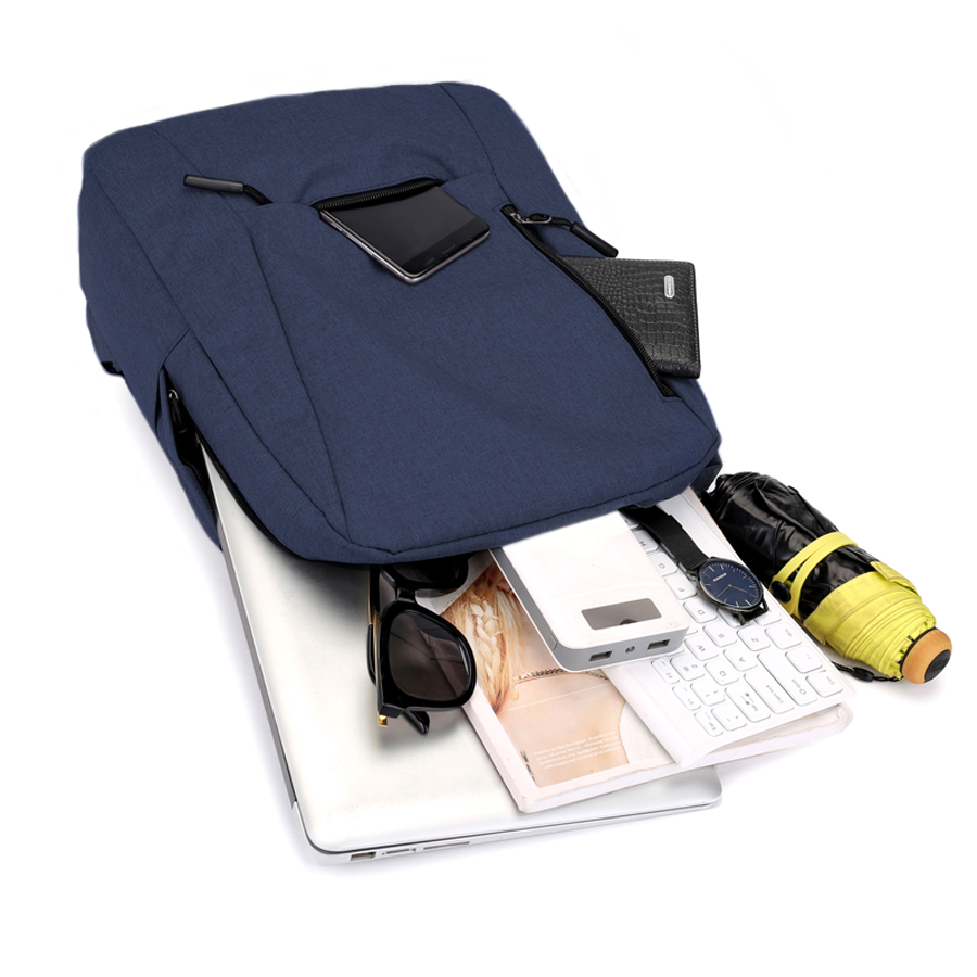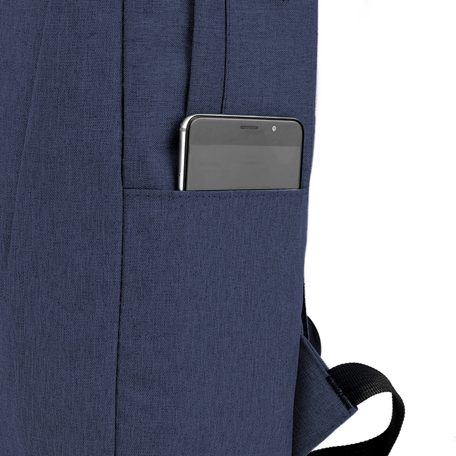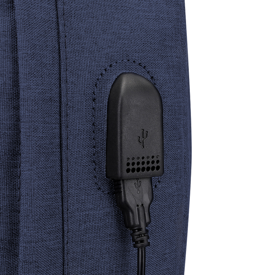 На передней стенке два кармана на молниях, один из них скрытый. Сбоку два открытых кармана и USB-разъем с проводом для подключения внешнего аккумулятора.