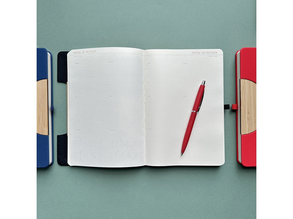 Обложка, выполненная из экокожи с покрытием Soft Touch, создает приятные тактильные ощущения при соприкосновении с ежедневником. Украшает обложку деревянный элемент и вырубка в форме полукруга. Ну, а вишенка на торте – мягкая линия сгиба в центре обложки, позволяющая использовать ежедневник в качестве подставки под телефон. А маленькая петля из резинки – отличное решение для фиксации шариковой ручки, она всегда будет под рукой. Есть еще одна удобная деталь ежедневника - ляссе в цвет обложки для быстрой навигации.