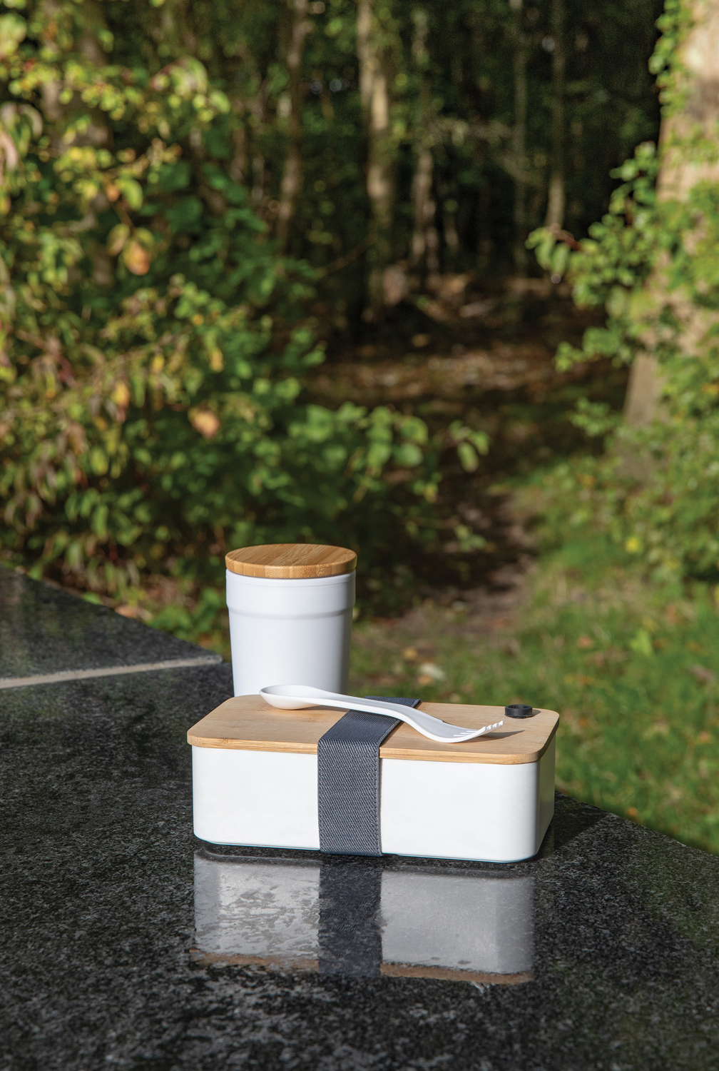 С этим стильным ланчбоксом из переработанного полипропилена, сертифицированного RCS, вы не останетесь без обеда или перекуса на работе или на пикнике, на прогулке или в поездке. Ланчбокс состоит из двух отделений, которые можно регулировать съемной перегородкой. На бамбуковой крышке есть отверстие для вывода пара. В комплект входят эластичный ремешок из rPET и ложка-вилка. Объем ланчбокса — 1,4 литра.