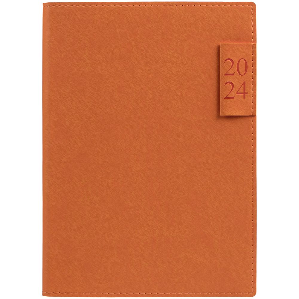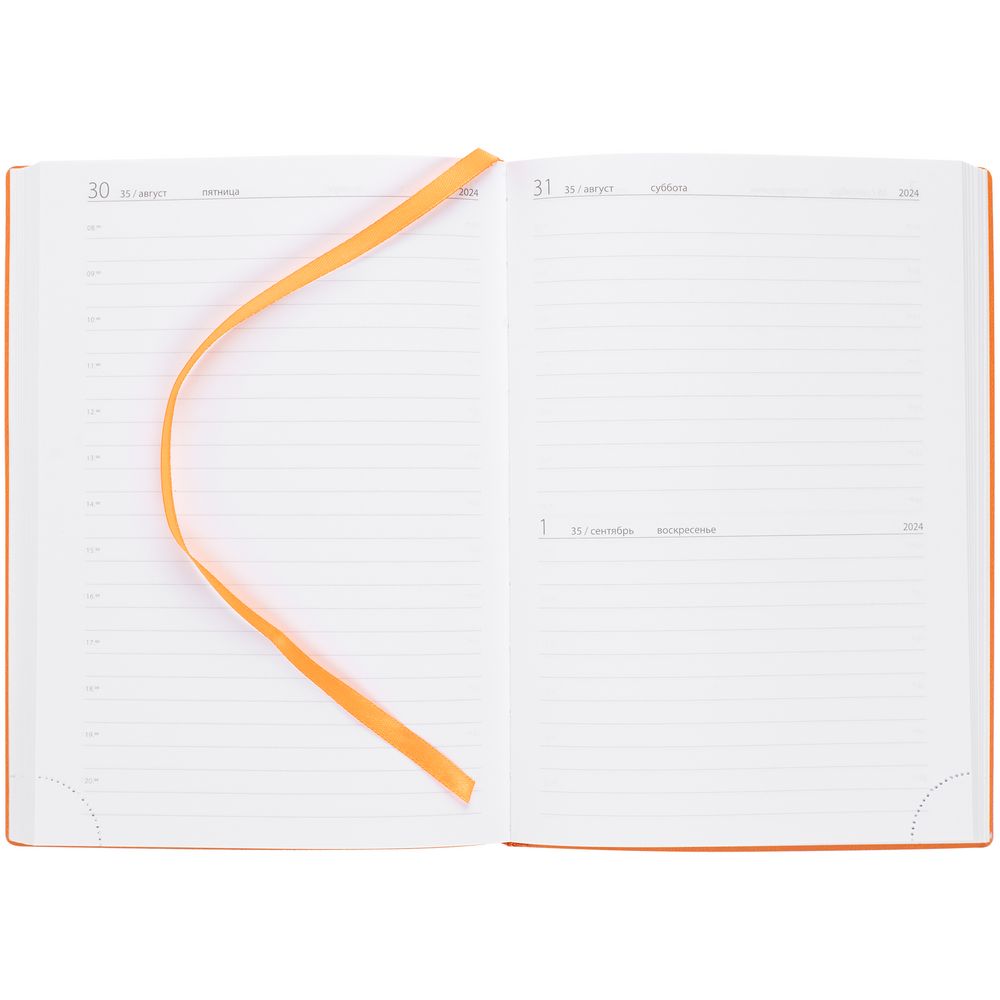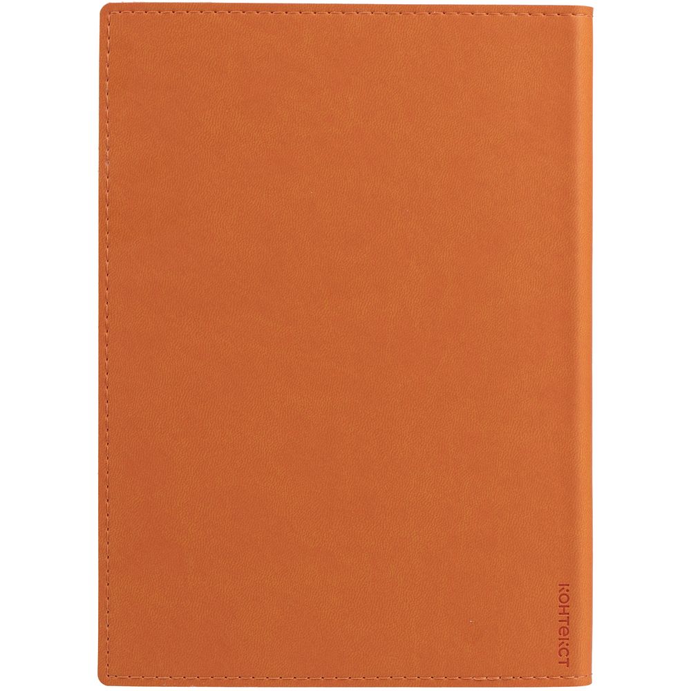 Ежедневник с гибкой обложкой, выполнен из сдвоенного материала Latte, оранжевого ОО, дополнен ляссе и капталом в цвет обложки.
