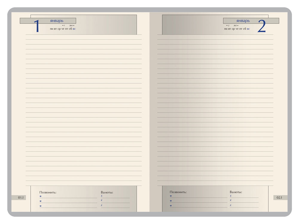 • удобно организованный полудатированный блок из бежевой бумаги плотностью 70 г/кв.м, с линовкой серого цвета;