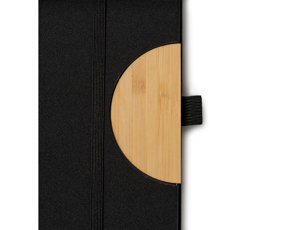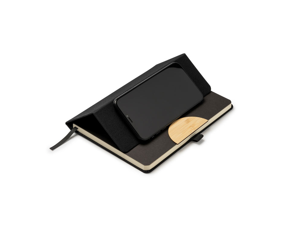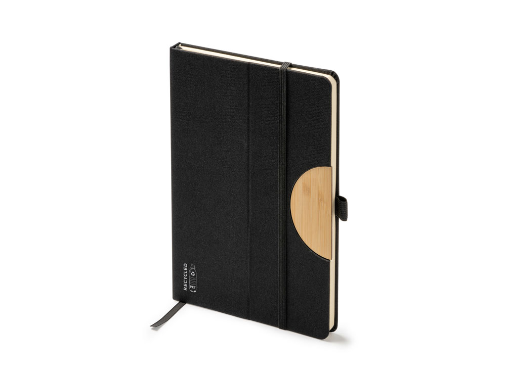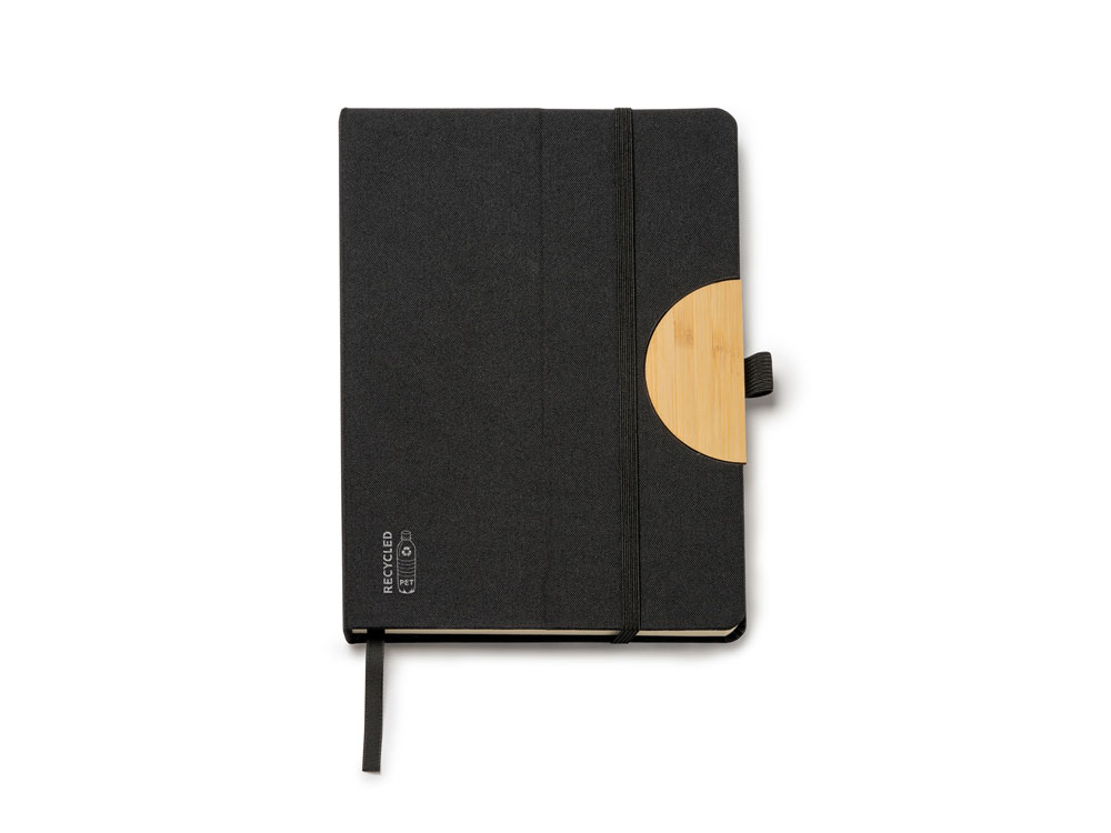 Блокнот формата А5 с жесткой обложкой из RPET с функцией подставки. Эластичная застежка, закладка и держатель для ручки. 80 листов.