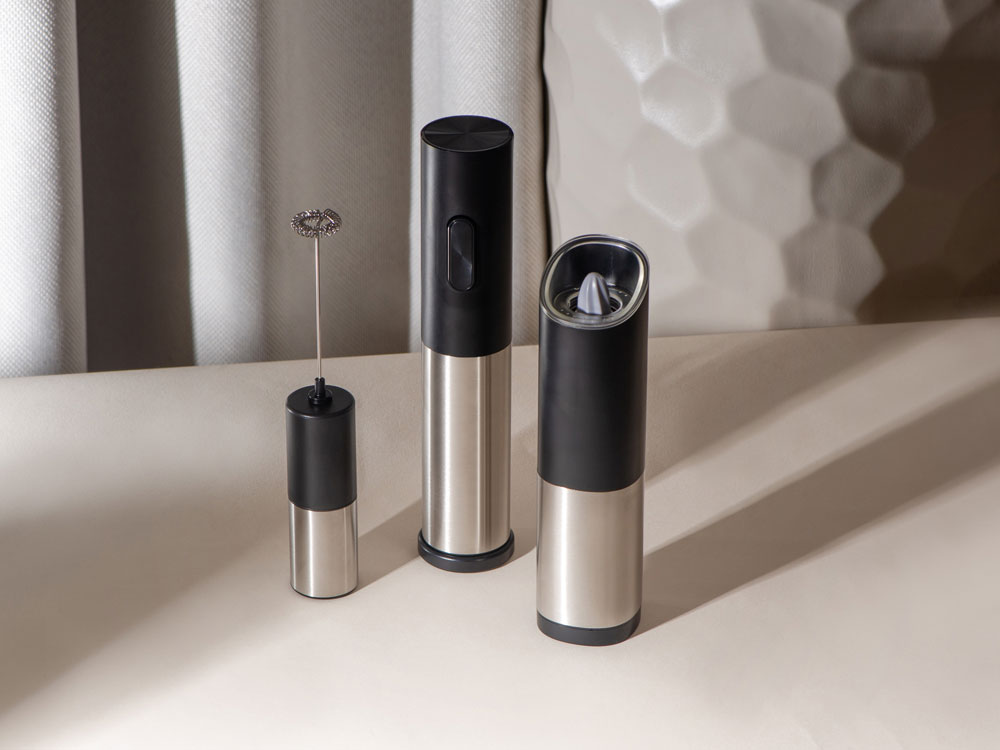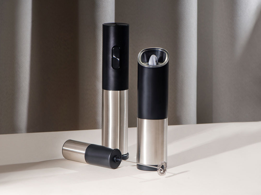 Электрический штопор RIOJA бренда Master of Wine — прекрасный подарок любителю вина: эта модель поставляется в элегантной упаковке в комплекте с подставкой, которая также может выступать в роли ножа для фольги. Благодаря устойчивой и функциональной подставке штопор всегда будет под рукой, а внешний вид Rioja станет настоящим украшением барной стойки или кухни.