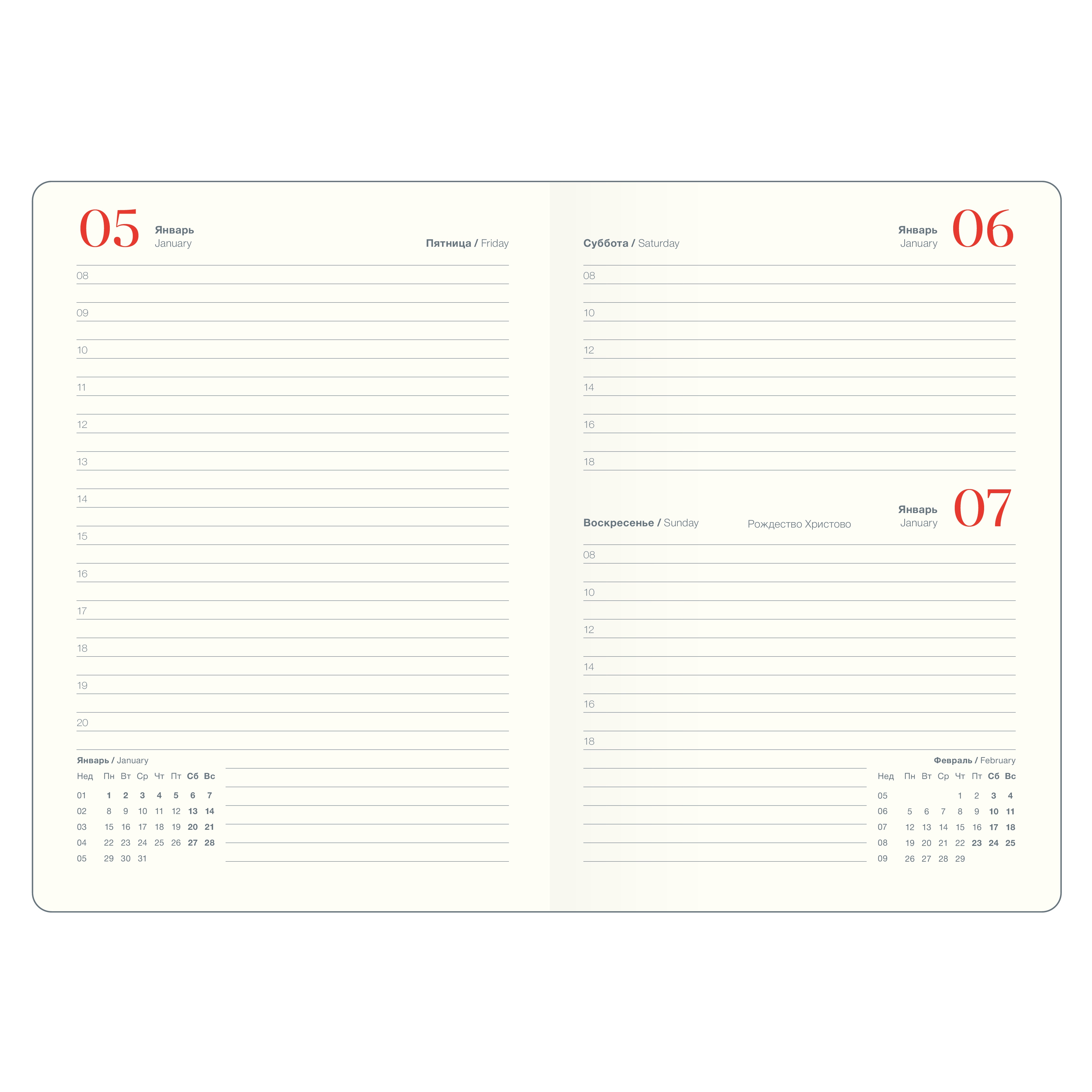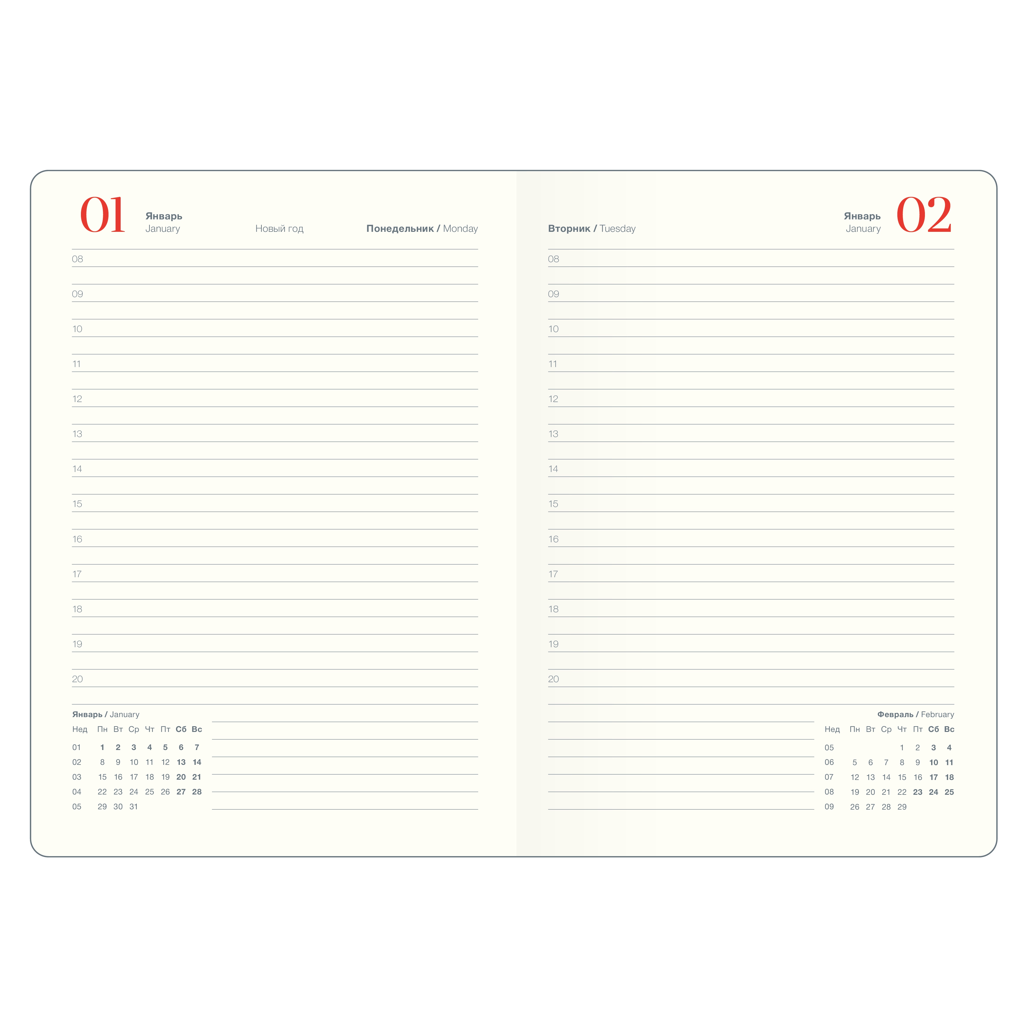 В ежедневнике также имеются две удобные атласные закладки, которые помогут быстро найти нужные развороты.