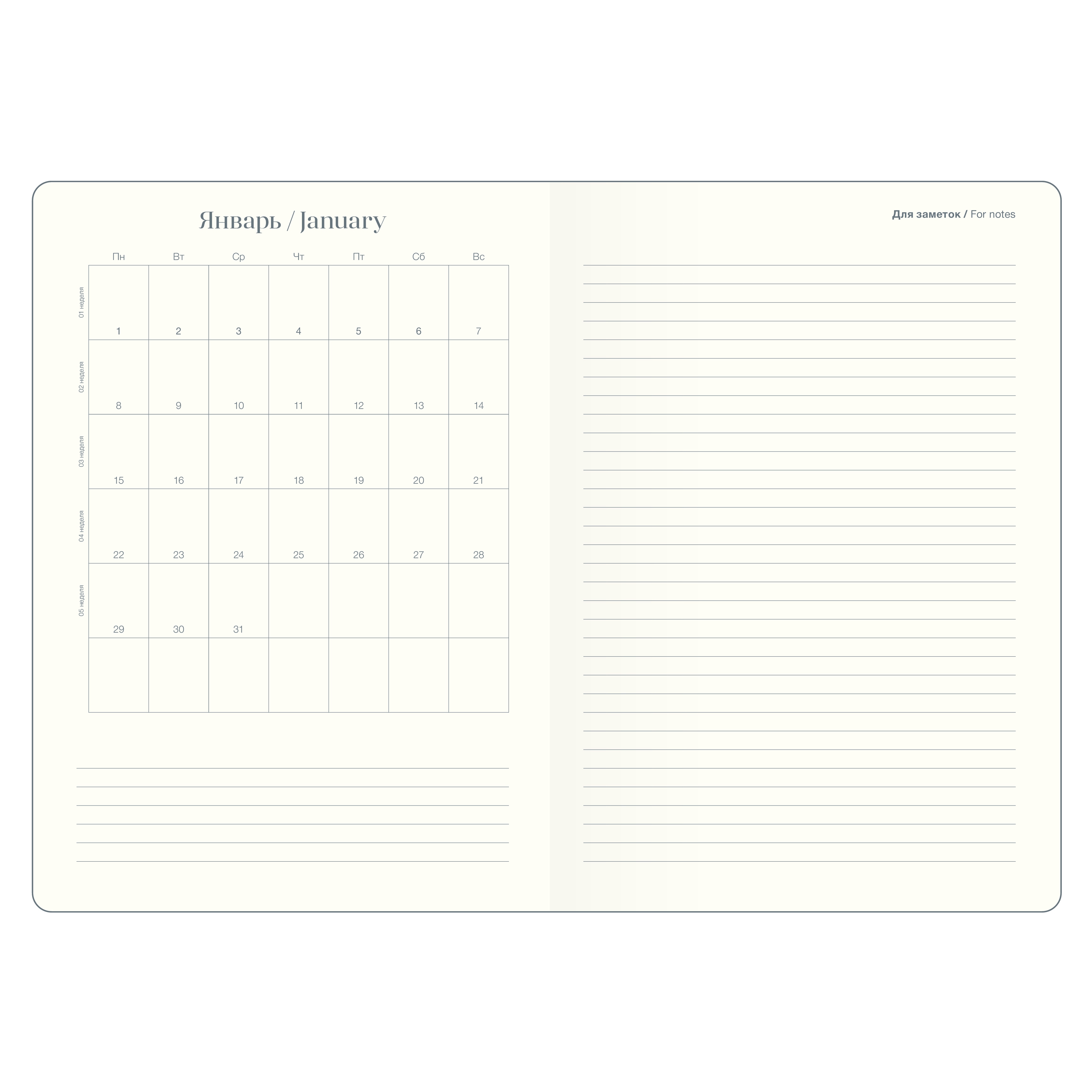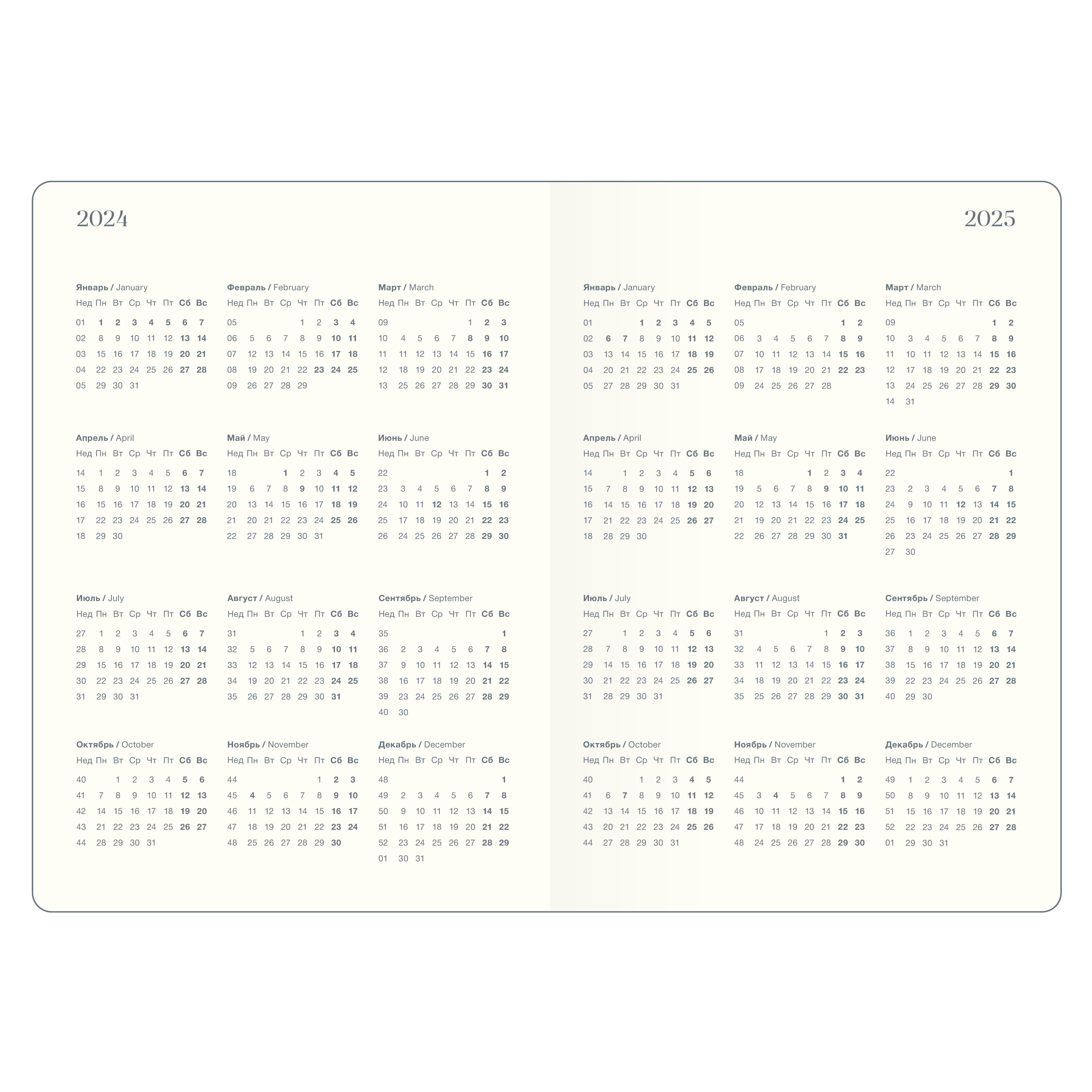 Датированный внутренний блок в линейку на 176 листов (352 страницы) - из высококачественной бумаги цвета слоновой кости плотностью 70 г/м2 со скругленными уголками и окрашенным обрезом. Информационный блок ежедневника включает в себя: титульный лист, календари на 2024-2005 гг, раздел "планы на год", развороты для заметок в начале и конце блока, планнер перед каждым месяцем.