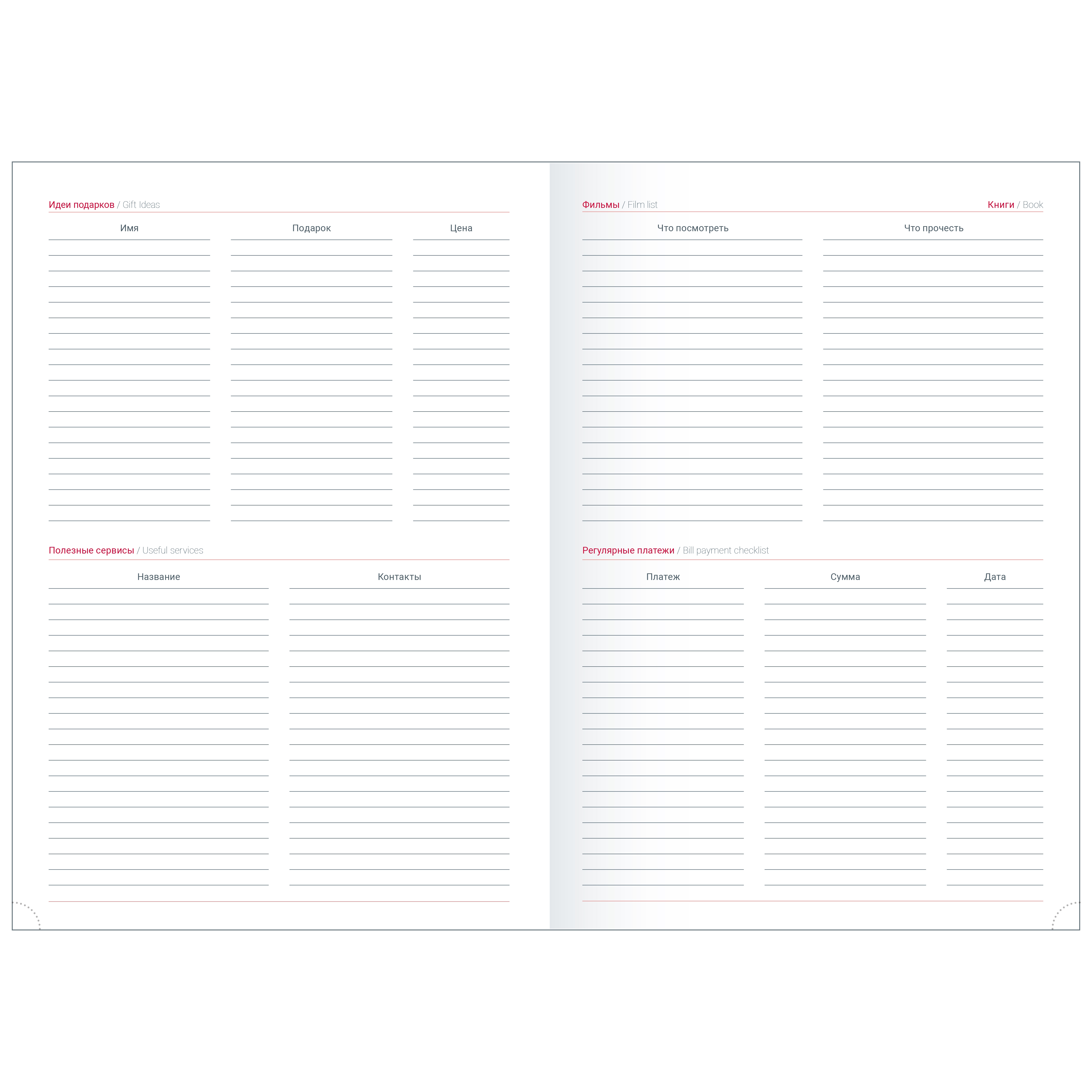 Датированный внутренний блок в линейку на 64 листа (128 страниц) - из высококачественной бумаги 100% белизны и плотностью 70 г/м2 с прямыми уголками с микроперфорацией. Информационный блок еженедельника включает в себя: личные данные, календари на 2024-2025 гг, планирование задач на год, развороты с информацией: главные российские праздники, разница во времени между Москвой и городами России, международные единицы мер и формат бумаги, пищевая ценность продуктов, расход калорий при физических нагрузках, время распада алкоголя в крови; развороты с важными датами, разворот для записей: "идеи для подарков", "фильмы", "книги", "полезные сервисы" и "регулярные платежи"; место для заметок.