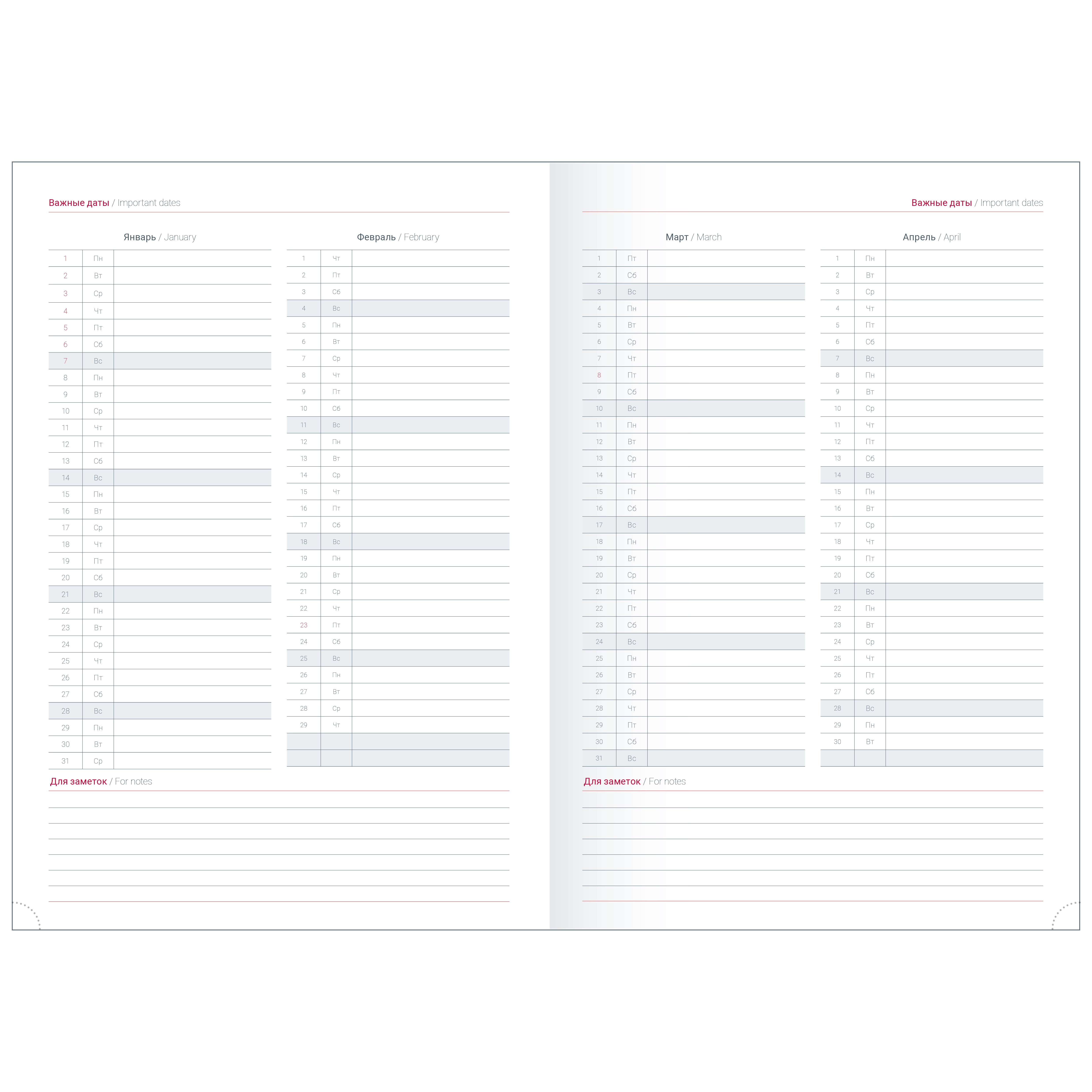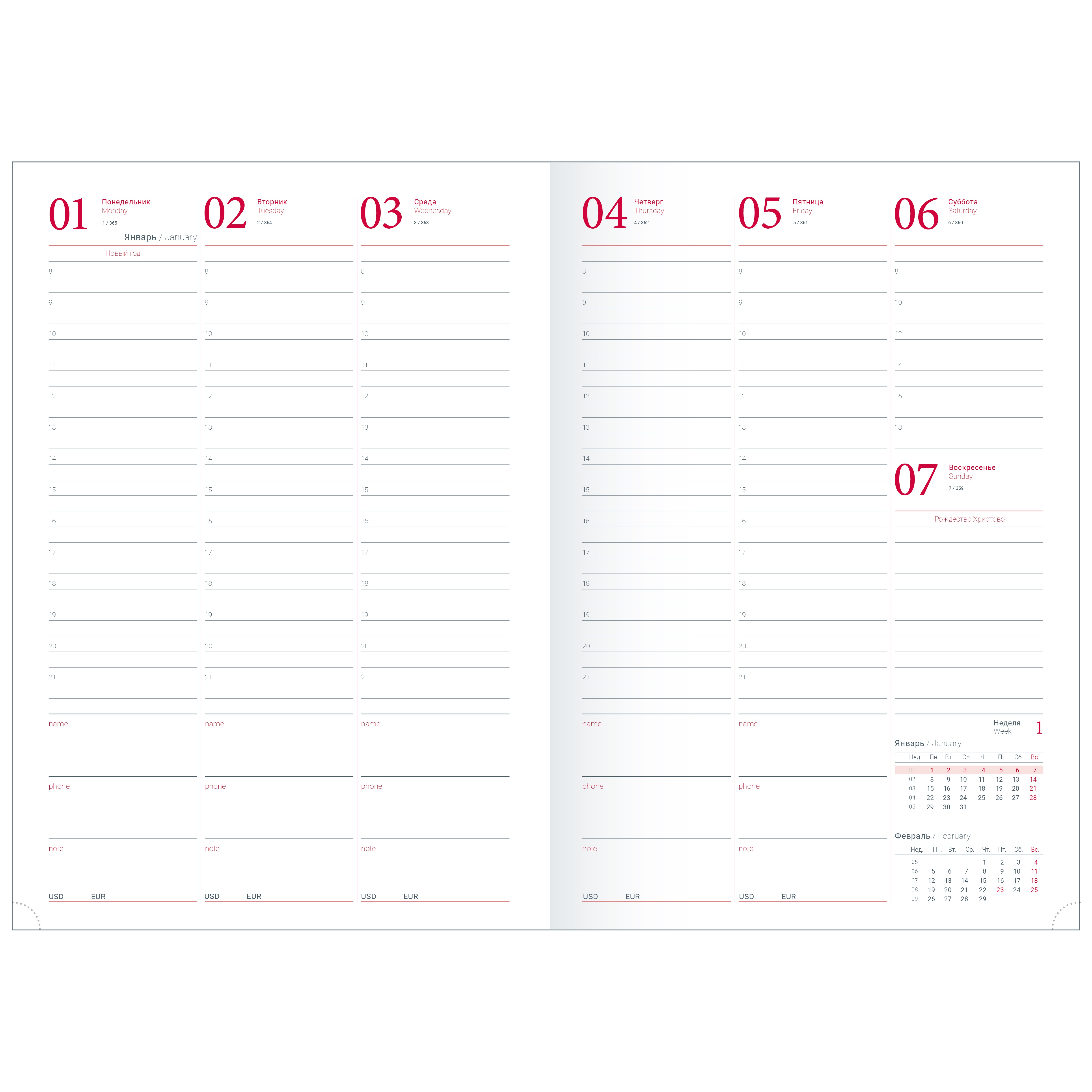 Твердая с поролоном обложка из приятной искусственной кожи с аккуратным тиснением года и декоративным тиснением по корешку имеет прямые уголки. Благодаря крепкому ниткошвейному скреплению еженедельник верно прослужит весь год.
