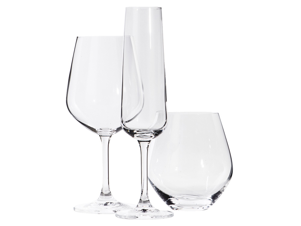 Набор бокалов состоит из 18 предметов - из шести бокалов-флютов для игристых вин, из шести бокалов для красного вина и из шести бокалов без ножки для разных видов напитков, в частности, для коктейлей. Все бокалы выполнены из бессвинцового хрусталя, экологически чистого материала, который сохраняет кристальную прозрачность, не тускнея и не мутнея.