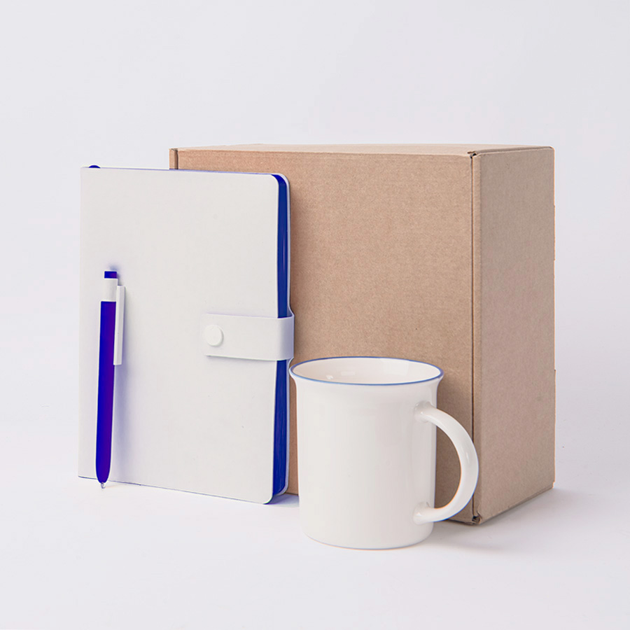 Набор подарочный : кружка, блокнот, ручка, коробка, стружка, белый с синим, темно-синий, белый