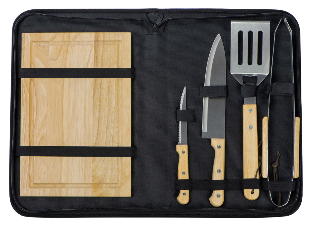 Набор из шести приспособлений для барбекю и гриля - в состав входят разделочная доска, щипцы, лопатка, нож для стейка, нож большой, а упаковывается сет в чехол из полиэстера.