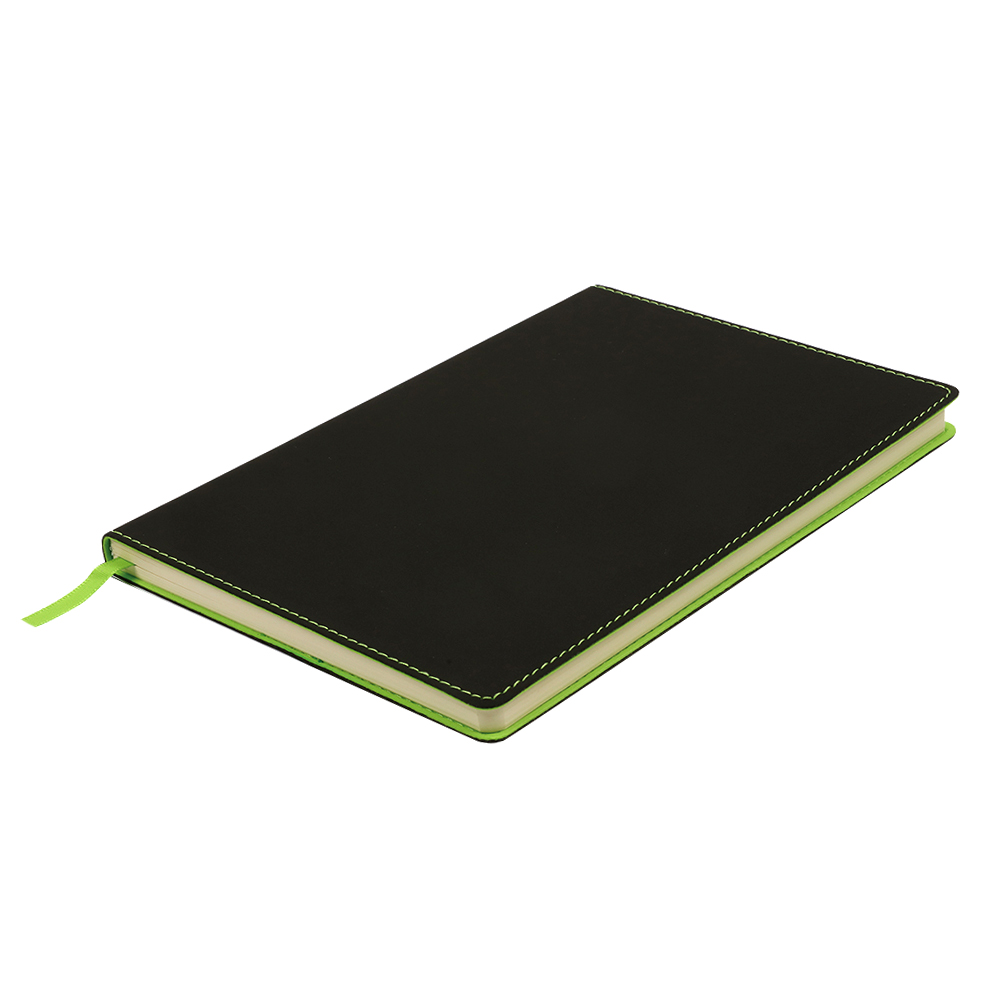 Блонот формата А5 в мягкой обложке из искусственной кожи. Материал обложки - термополиуретан. Основной цвет - чёрный; строчка по периметру, внутенний край и ляссе - зелёного цвета. Размеры: 214*144мм, 80 листов, разлинееные страницы, бумага плотностью 80г/м2.