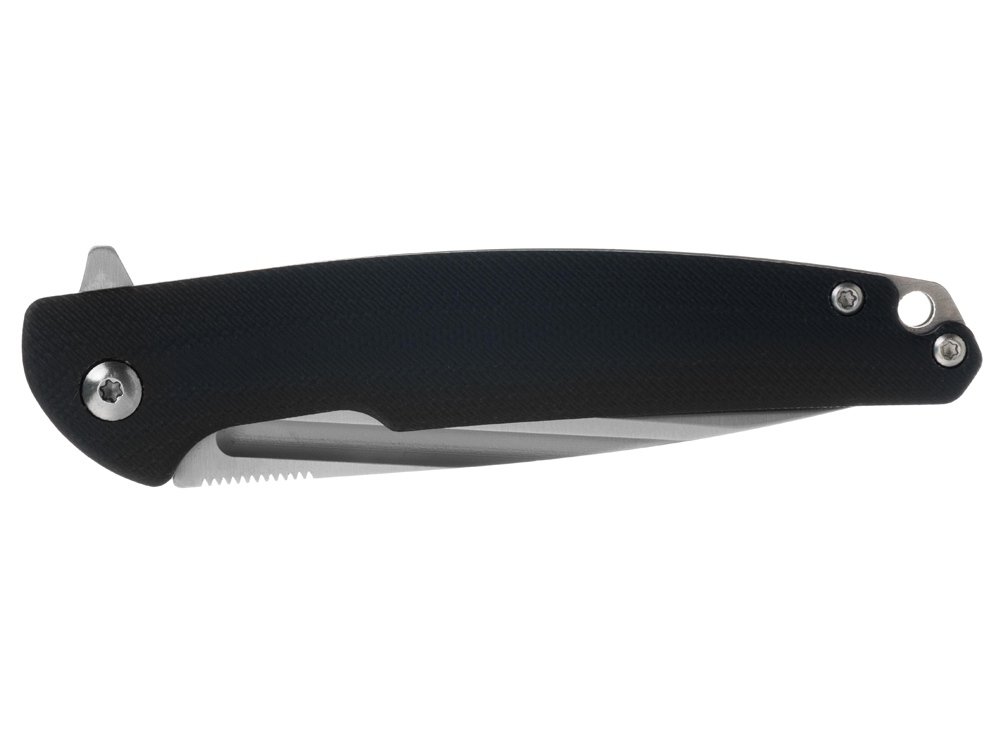 Рукоять ножа изготовлена из стали с накладками из стеклотекстолита G10 - композитного материала на основе стеклоткани и эпоксидной смолы. G10 является прочным и ударостойким материалом, отлично переносит влагу, отличается повышенной стойкостью к огню. Рукоять ножа собрана на втулках - бонках, поэтому при необходимости его можно легко промыть. На рукояти расположено отверстие для темляка и клипса для удобного размещения ножа в кармане.