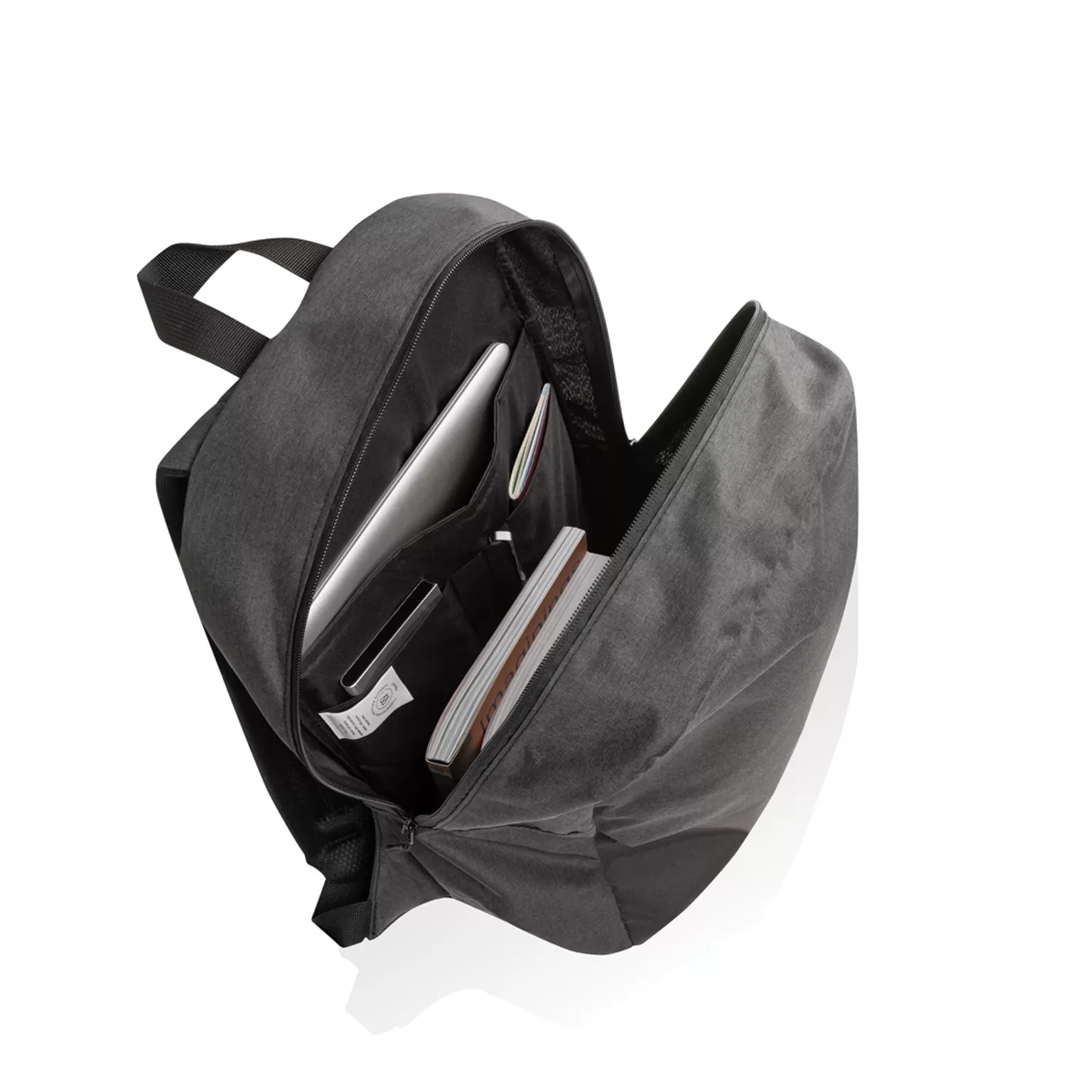 Рюкзак для ноутбука 15,6’’ из серии Kazu — практичное и современное решение для тех, кто не привык расставаться со своим гаджетом. Рюкзак подойдет и для города, и для поездок или путешествий, а классический минималистичный дизайн придется по душе и мужчинам, и женщинам. Внутри два отделения: одно для ноутбука 15,6’’, а во второе поместятся книги, ежедневник, документы или необходимые в поездке вещи. На перегородке между отделениями расположены небольшие кармашки для мелочей. Спереди рюкзак оснащен широким наружным карманом на молнии. Содержание вторичных материалов: 100%. Сертифицировано AWARE™. Наличие индикаторных частиц AWARE™ подтверждает, что мы действительно используем переработанные материалы. 2% с продажи каждой вещи, отмеченной сертификатом AWARE™, мы перечисляем в поддержку всемирной организации Water.org.