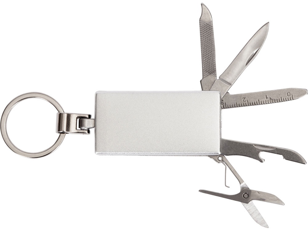 Брелок-мультитул на кольце в металлическом корпусе с заметным полем под нанесение.