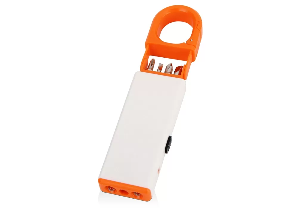 Компактный и удобный светодиодный фонарик скрывает под корпусом небольшой набор инструментов. Фонарик можно прикрепить к ключам при помощи специальной застежки. На поверхность корпуса можно разместить логотип.