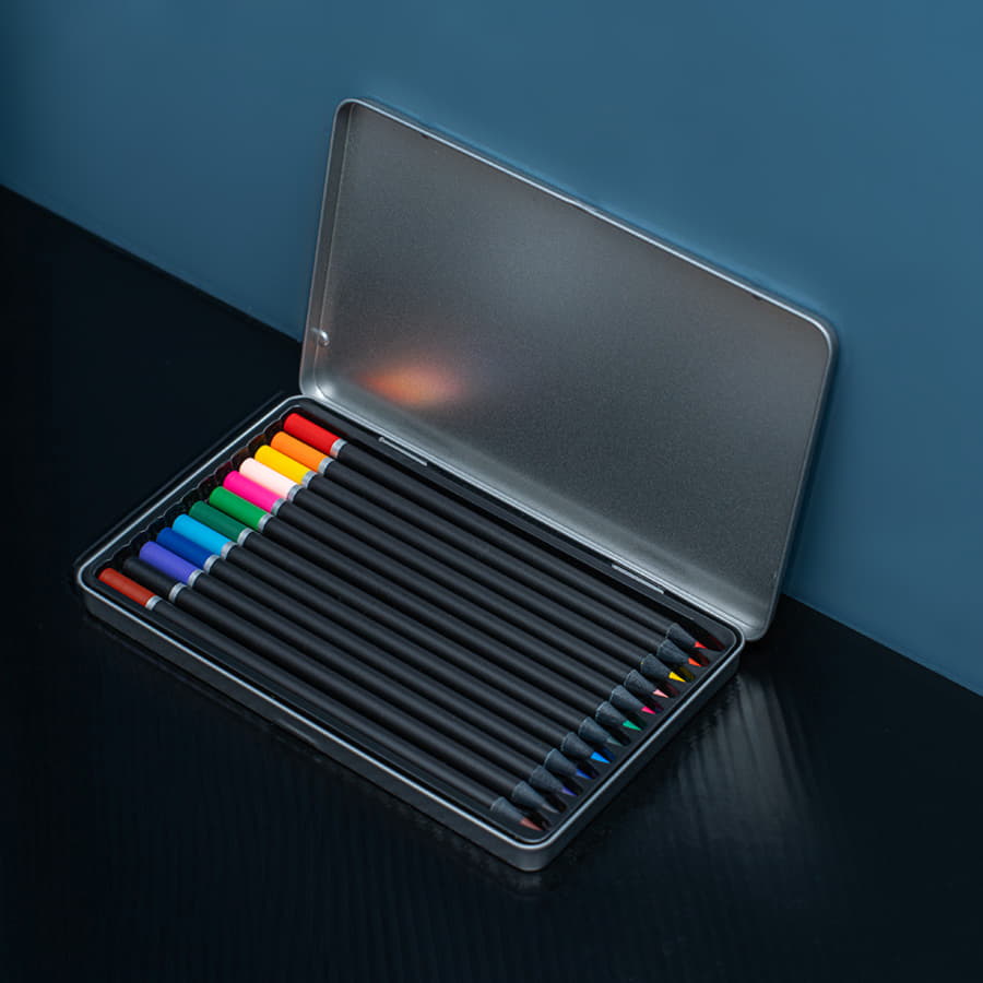 Наборы карандашей 12 цветов в металлической коробке серебристого цвета. Внутри коробки прослойка из пергаментной бумаги, чтобы карандаши не терлись о крышку и не оставляли след. Сама металлическая коробка упакована в крафтовую. Это для защиты при транспортировке, а так же дополнительные возможности для нанесения.