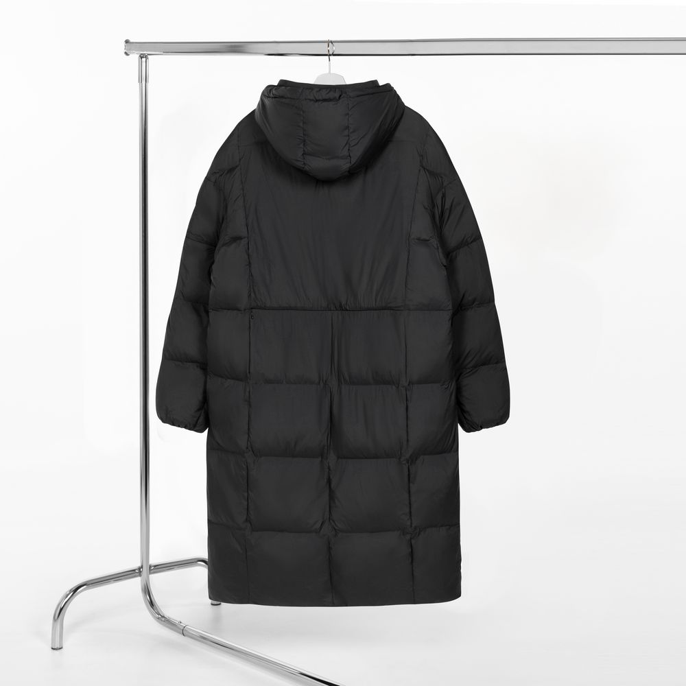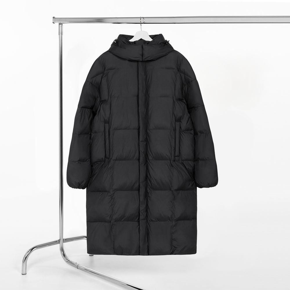 Удлиненный пуховик унисекс с капюшоном.