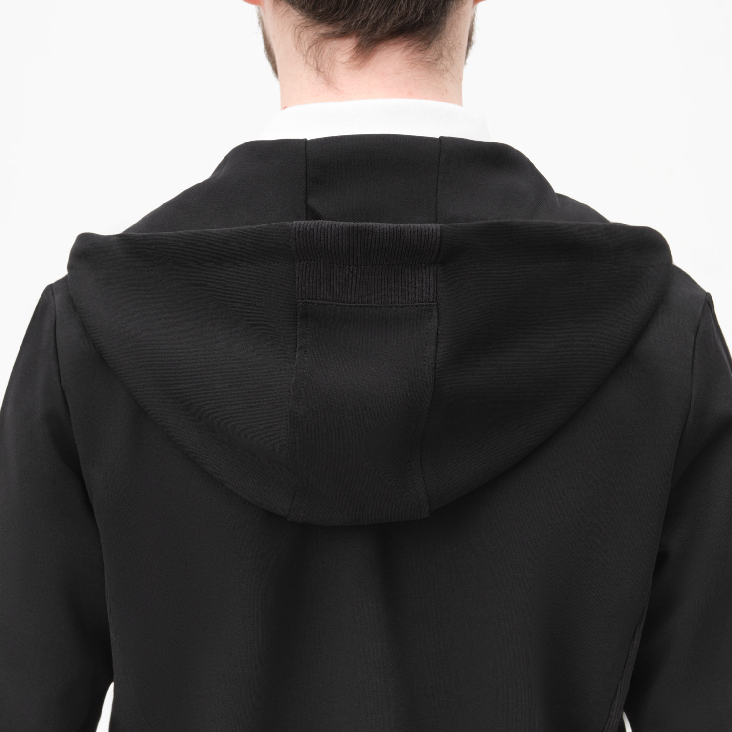 Толстовка сделана из мягкой и прочной ткани интерлок "doubleface", которая приятна к телу и легка в уходе, не растягивается, не выцветает и не деформируется после стирки. Манжеты и низ сделаны из плотной резинки 2х2, благодаря чему вещь держит форму. Карманы на потайных молниях придают толстовке аккуратный вид. Капюшон на подкладке из ткани джерси в тон регулируется шнурками.